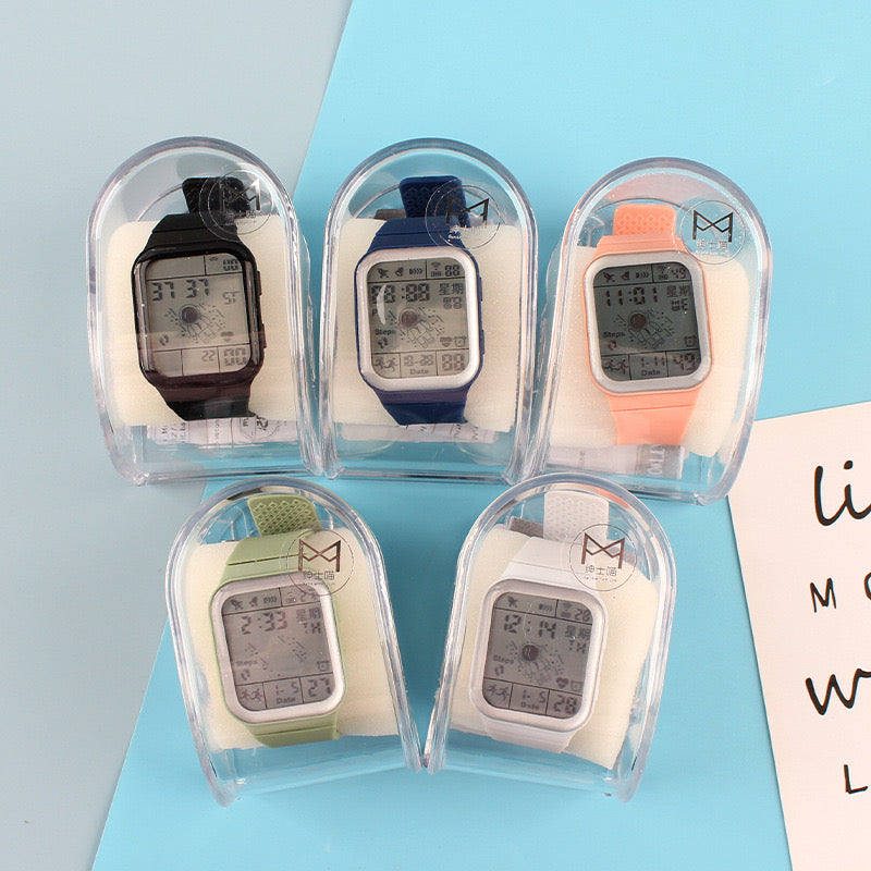 Smartwatch në formë drejtkëndore me rrip silikoni; Mat edhe sekondat; Mat hapat; Tregon rahjet e zemrës; me alarm; Materiali: PVC; Ngjyrat si në foto: