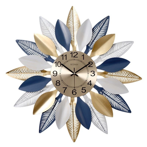 Orë murale gold me zbukurime gjethesh blu anash; Ngjyra si në foto ose e bardhë me të zezë dhe gold; Materiali: Metal; Përmasa: 60 cm