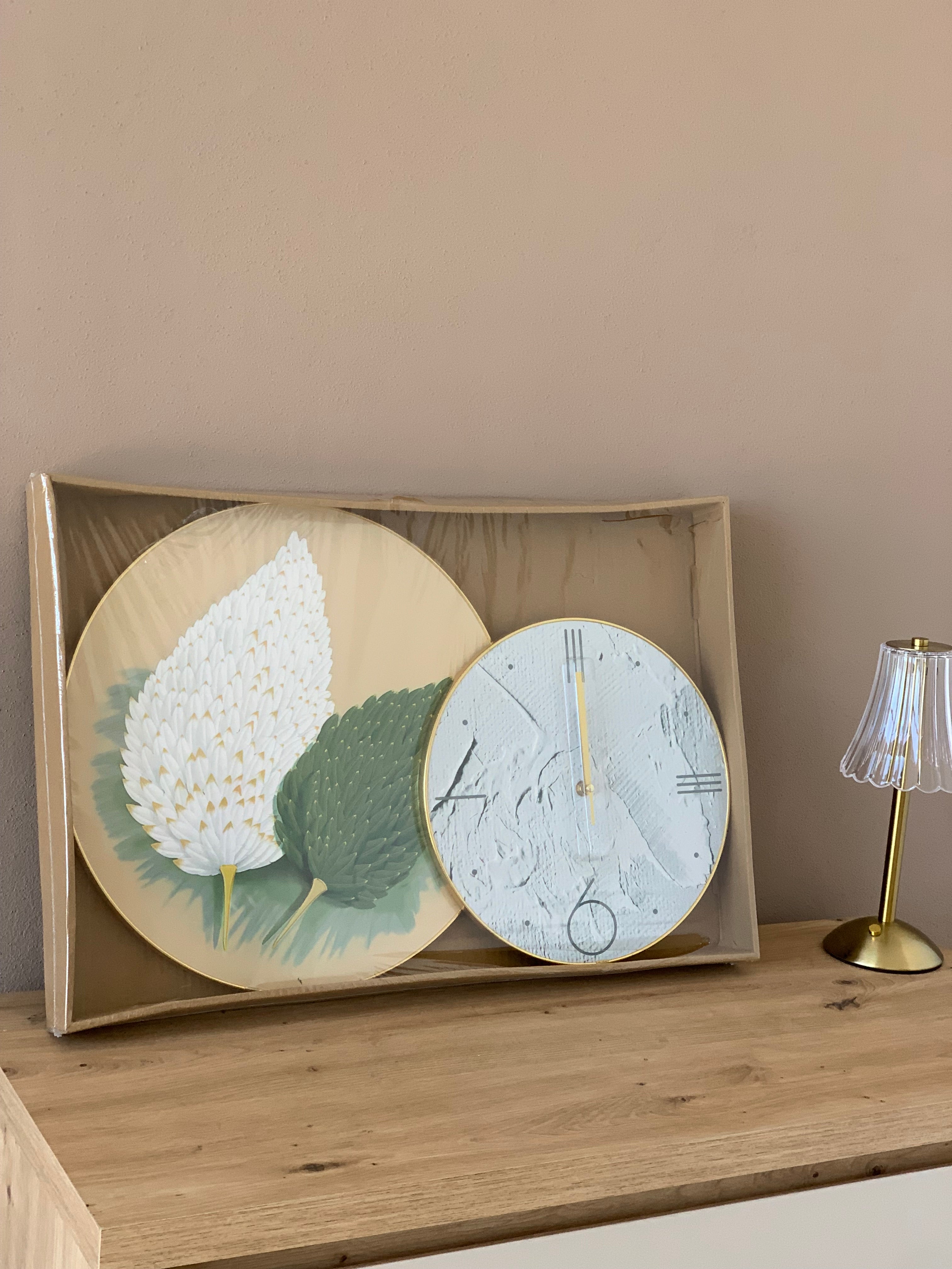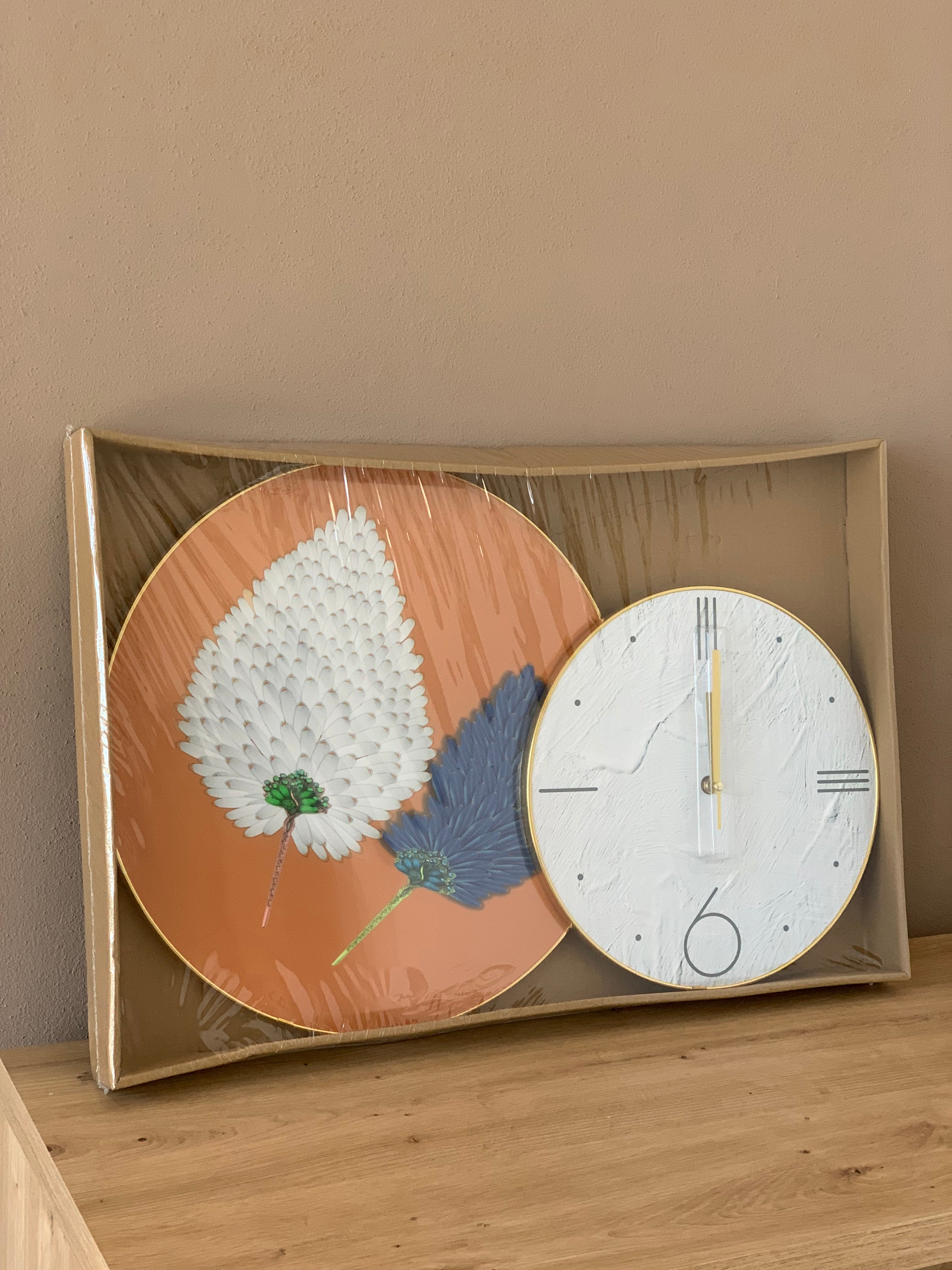 Dimensionet: 59*38cm  Diametri i pjesës së madhe (pikturë) 38cm  Diametri i orës: 30cm