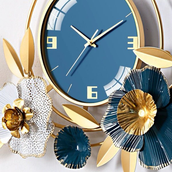 Orë muri dekorative me elementë lulesh e gjethesh në ngjyrën blu; Materiali: Metalike; Përmasat: 92 x 46 cm