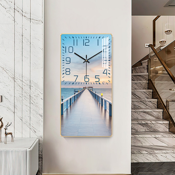 Orë muri qelqi me ndriçim LED me dy rrathë, njëra me orë me drerë dhe peshq dhe tjetra me pamje mali ideale për dekor restoranti, zyre apo shtëpie