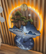 Orë muri qelqi me ndriçim LED me dy rrathë, njëra me orë me drerë dhe peshq dhe tjetra me pamje mali ideale për dekor restoranti, zyre apo shtëpie