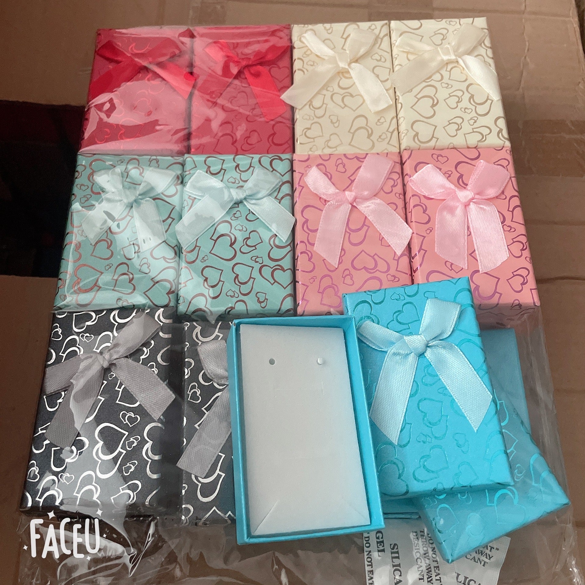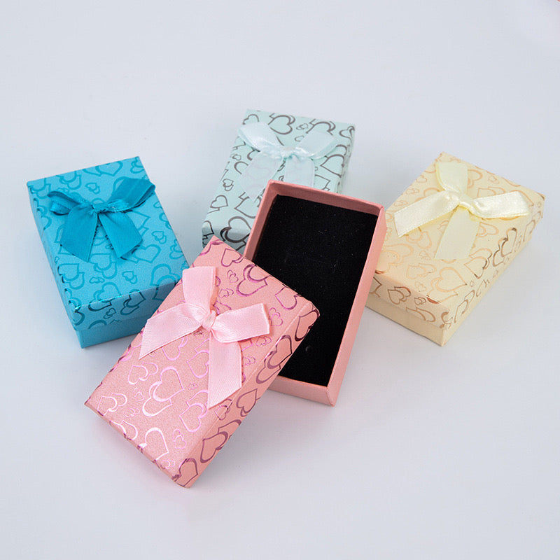 Kuti dhuratash kartoni – me dizajn elegant zemrash dhe fjongo dekorative. E përkryer për paketimin e bizhuterive apo dhuratave të vogla, e disponueshme në ngjyra të ndryshme.
