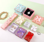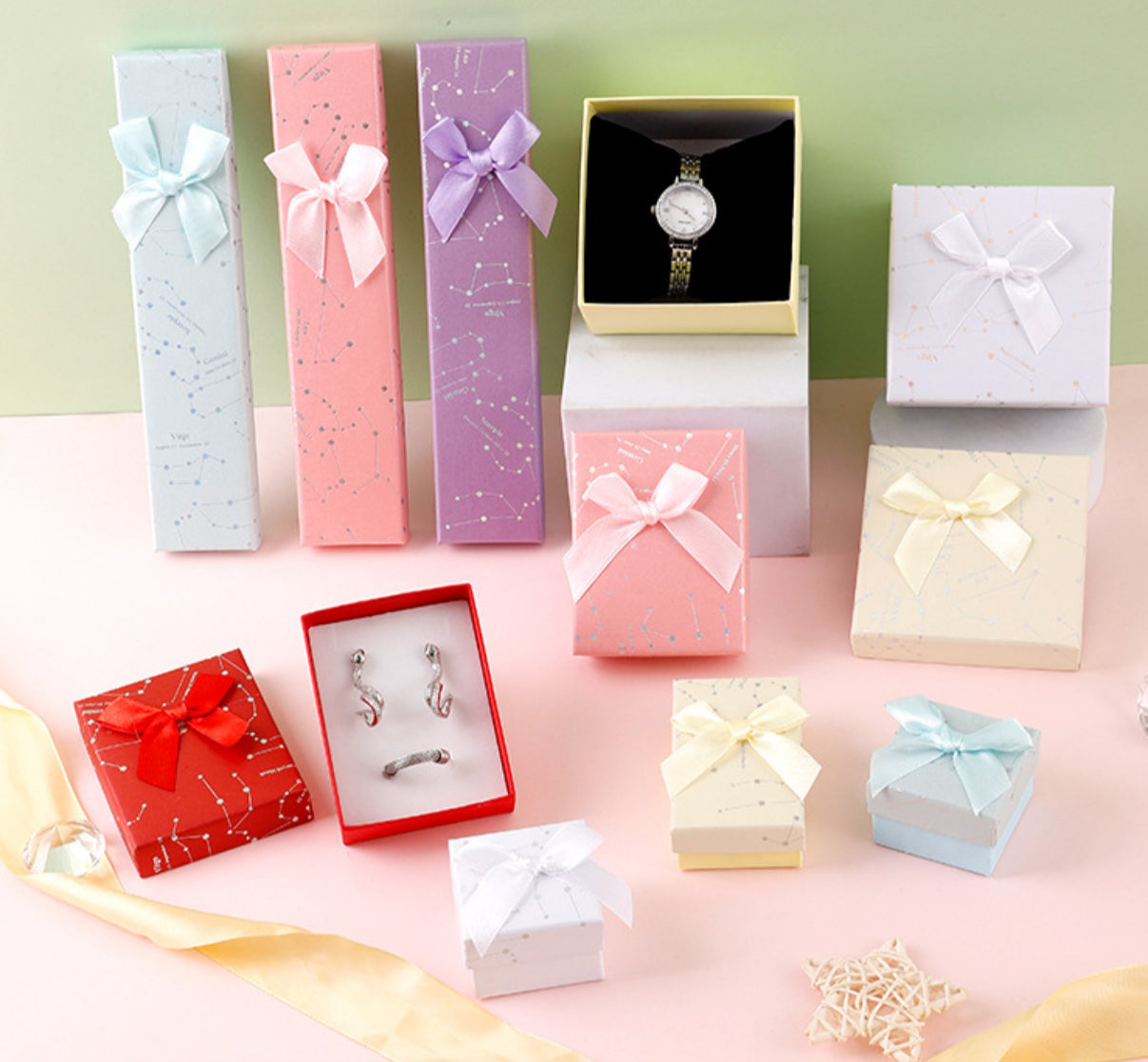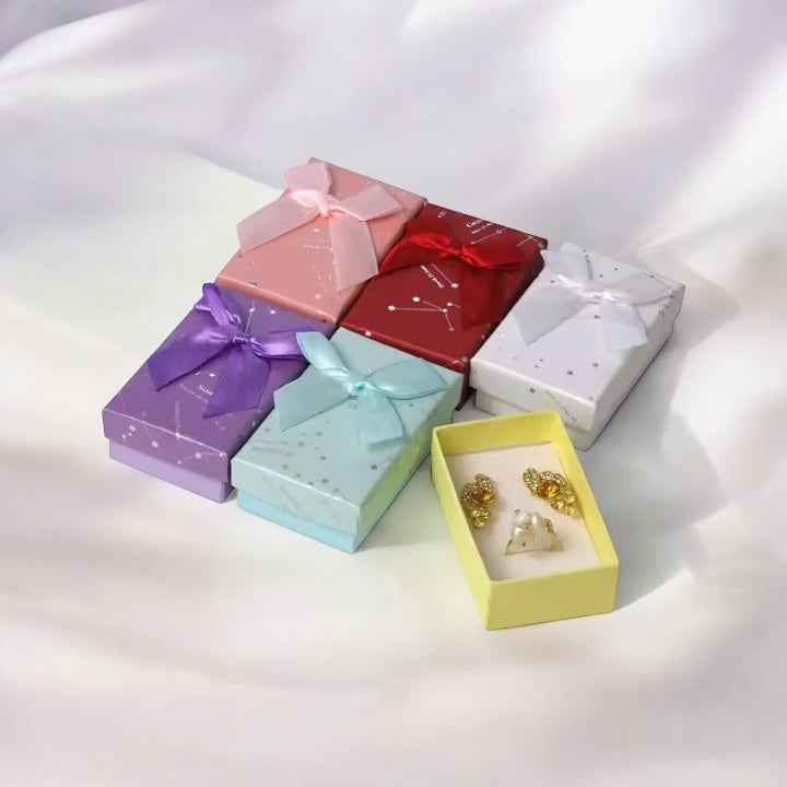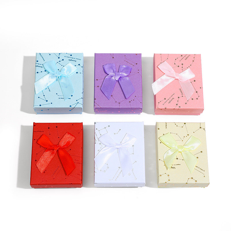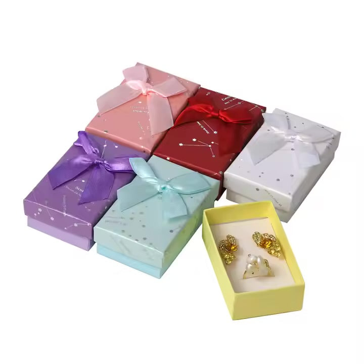 Kuti për bizhuteri me elementë yjesh; Përmasat: 5 cm x 8 cm x 2.5 cm; Ngjyrat: Rozë, blu, e bardhë, lejla, e kuqe, e verdhë