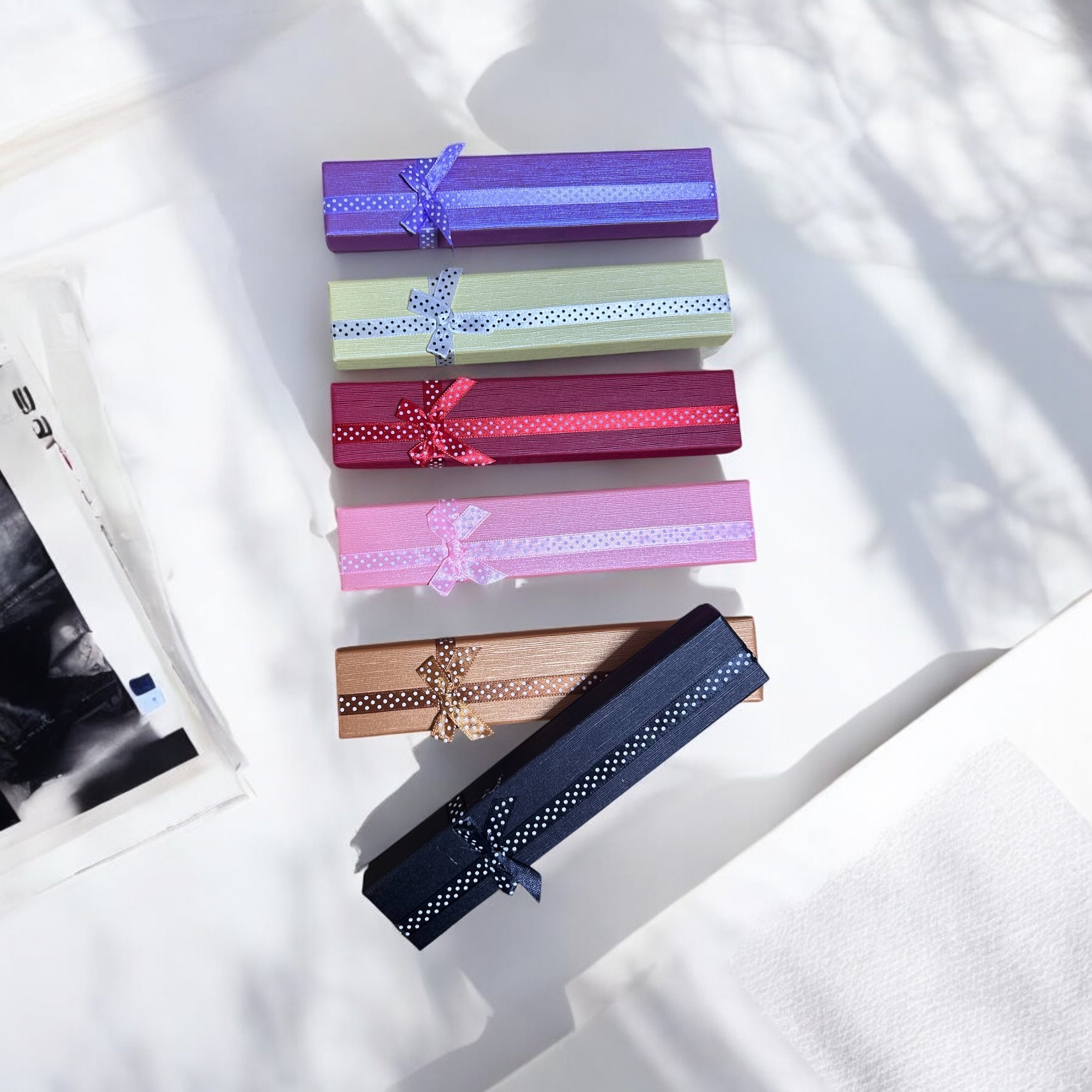Kuti për byrzylyk me fjongo me pika; Ngjyrat: E zezë, kafe, rozë, blu, e bardhë, e kuqe; Përmasat: 4.5*21*2*cm