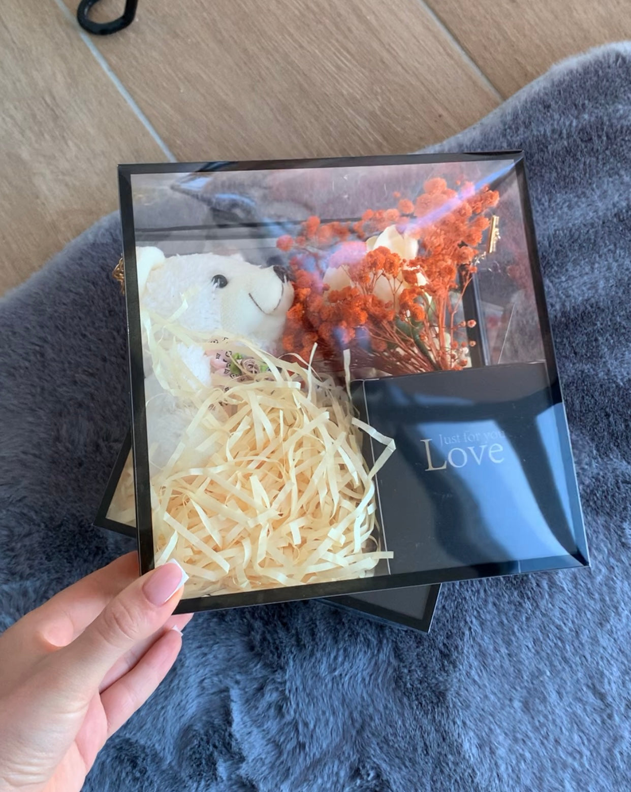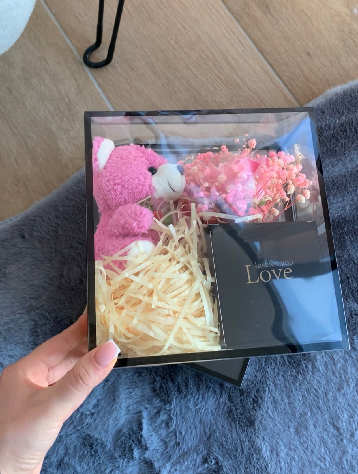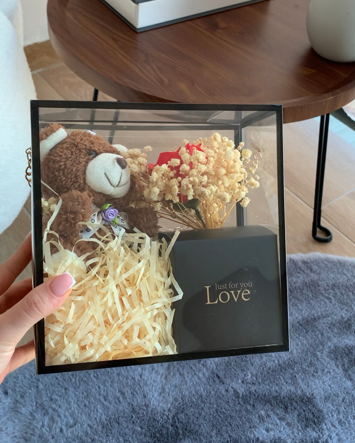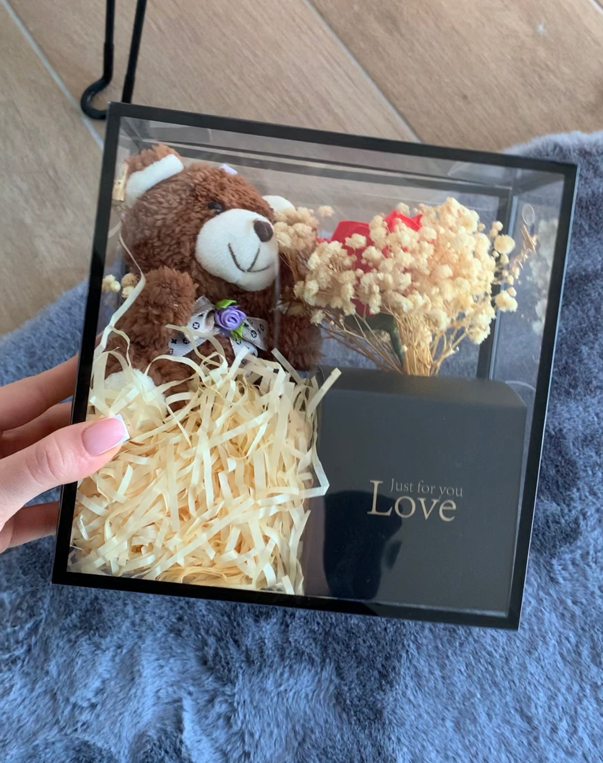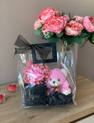 Pako dhurate e gatshme në kuti transparente (trëndafil, arush & kuti kartoni)