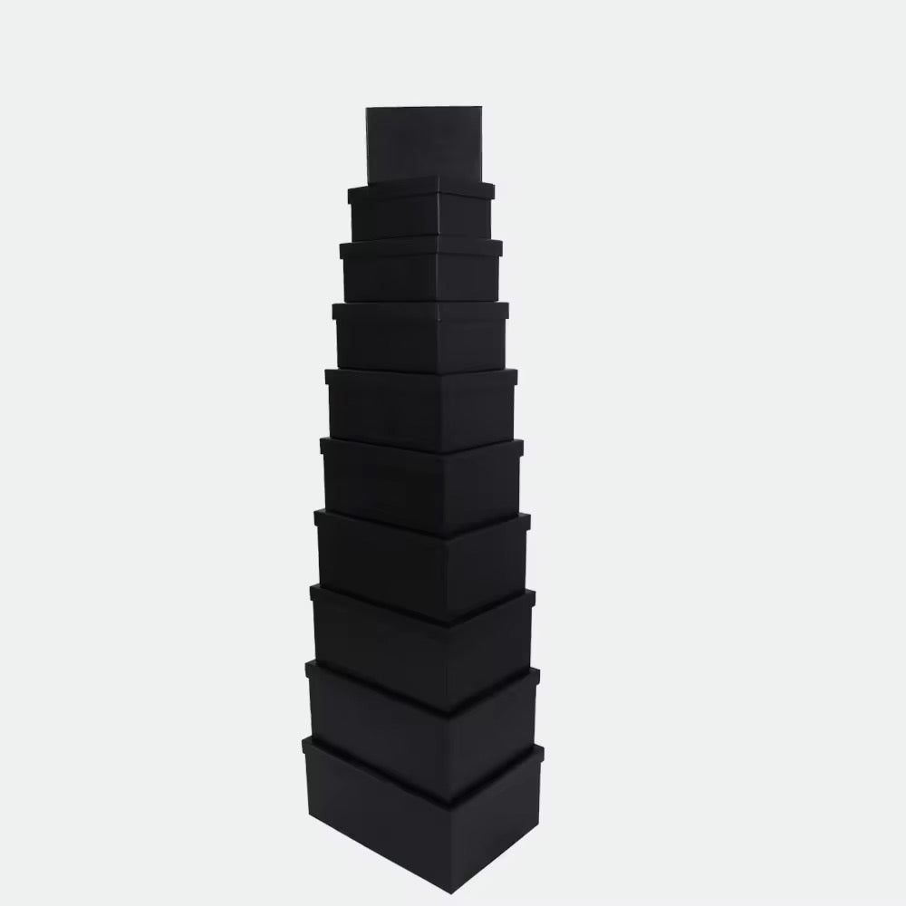 Set me 10 kuti paketimi dhuratash njëngjyrëshe; Ngjyrat: E zezë, rozë, e kuqe, silver, gold, marble; Përmasat: Më e vogla 19 cm x 13 cm x 7.5 cm deri tek më e madhja 37 cm x 29 cm x 16.5 cm