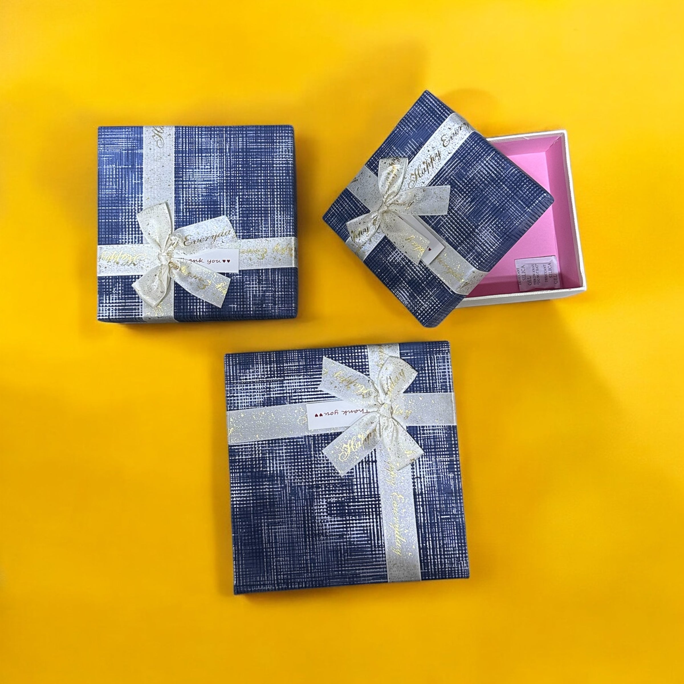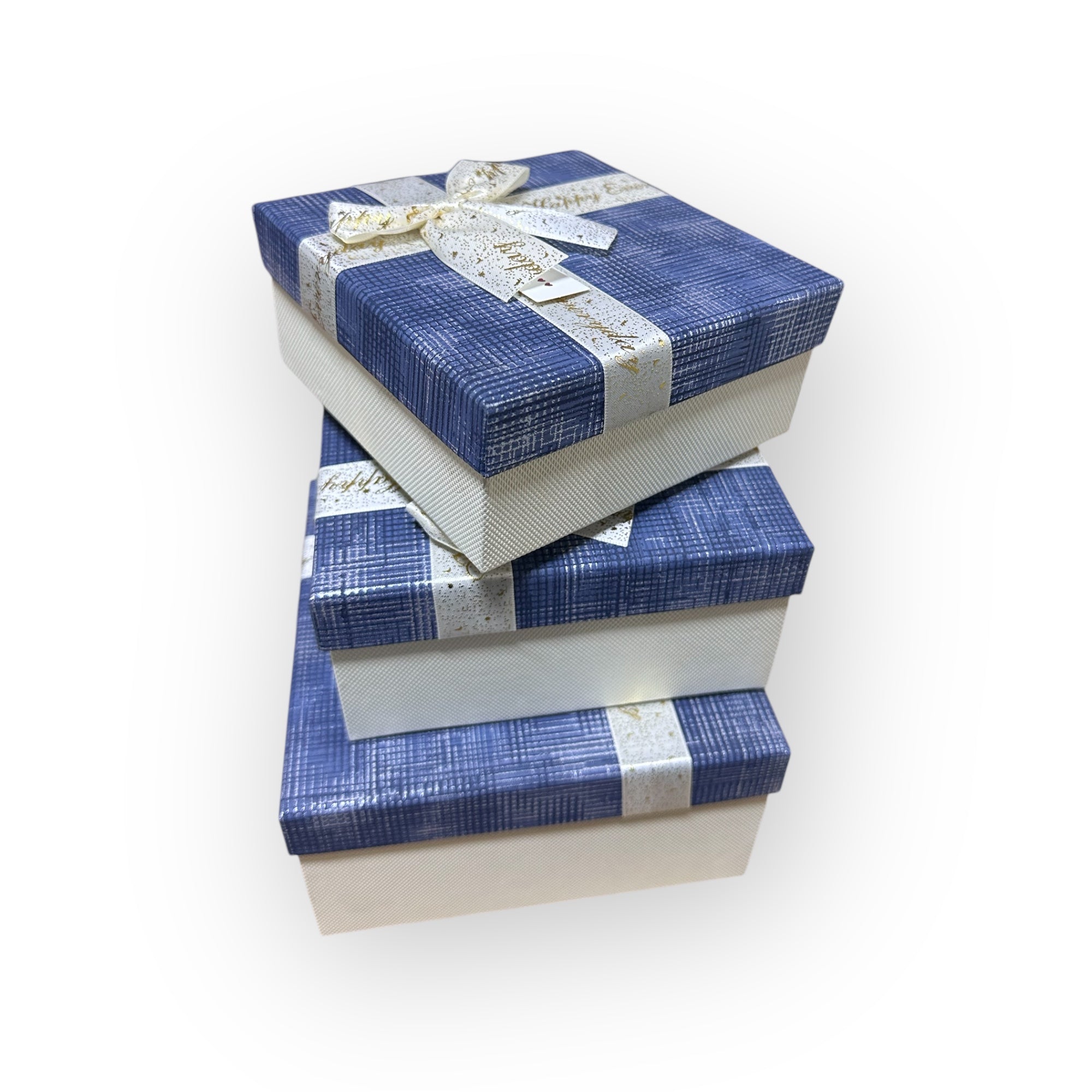 Set me 3 kuti paketimi dhuratash katrore me fjongo “Happy Everyday”; Ngjyrat: Blu, gri, rozë; Përmasat: 14 x 14 cm , 17 cm x 17 cm, 20 cm x 20 cm