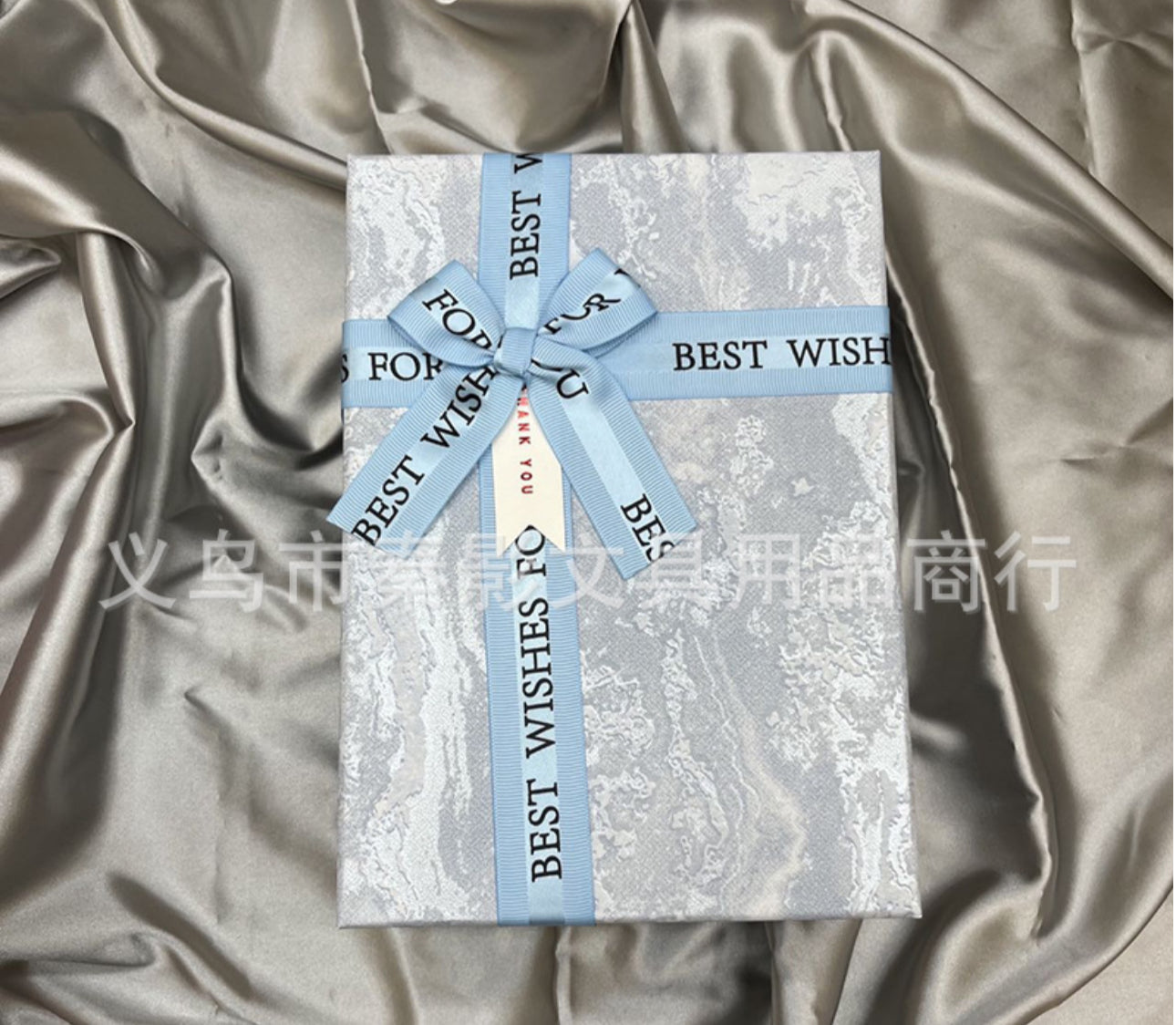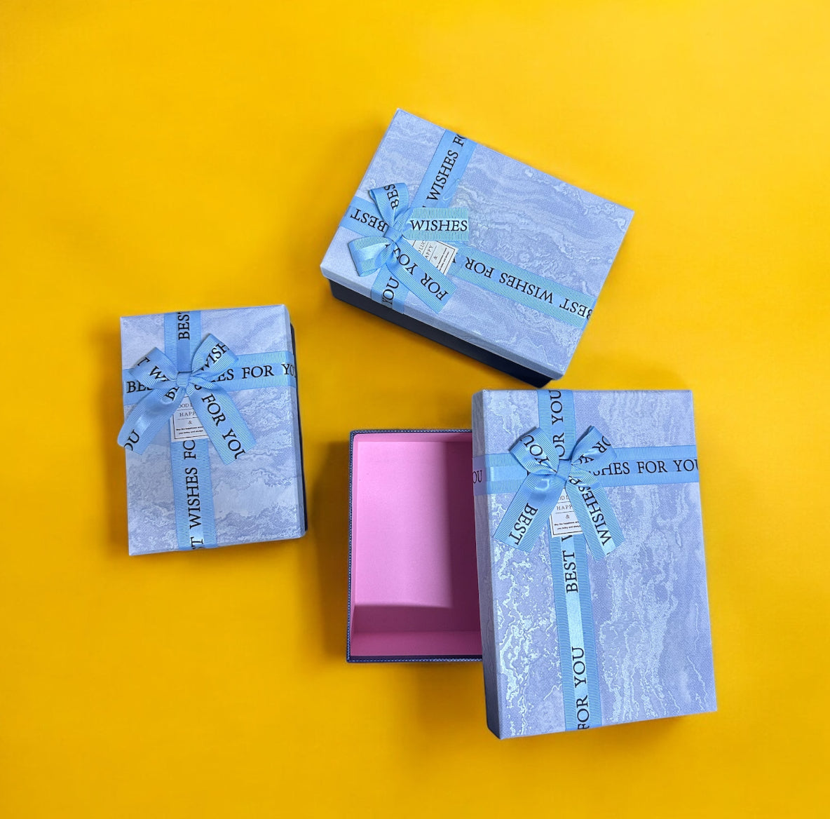 Set me 3 kuti paketimi me fjongo “Best wishes to you” dhe dizenjo valëzimesh; Ngjyrat: 2 nuanca Blu, rozë, gri; Përmasat: 12 x 22 cm, 14 x 24 cm, 16 x 26 cm