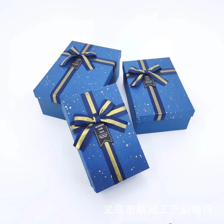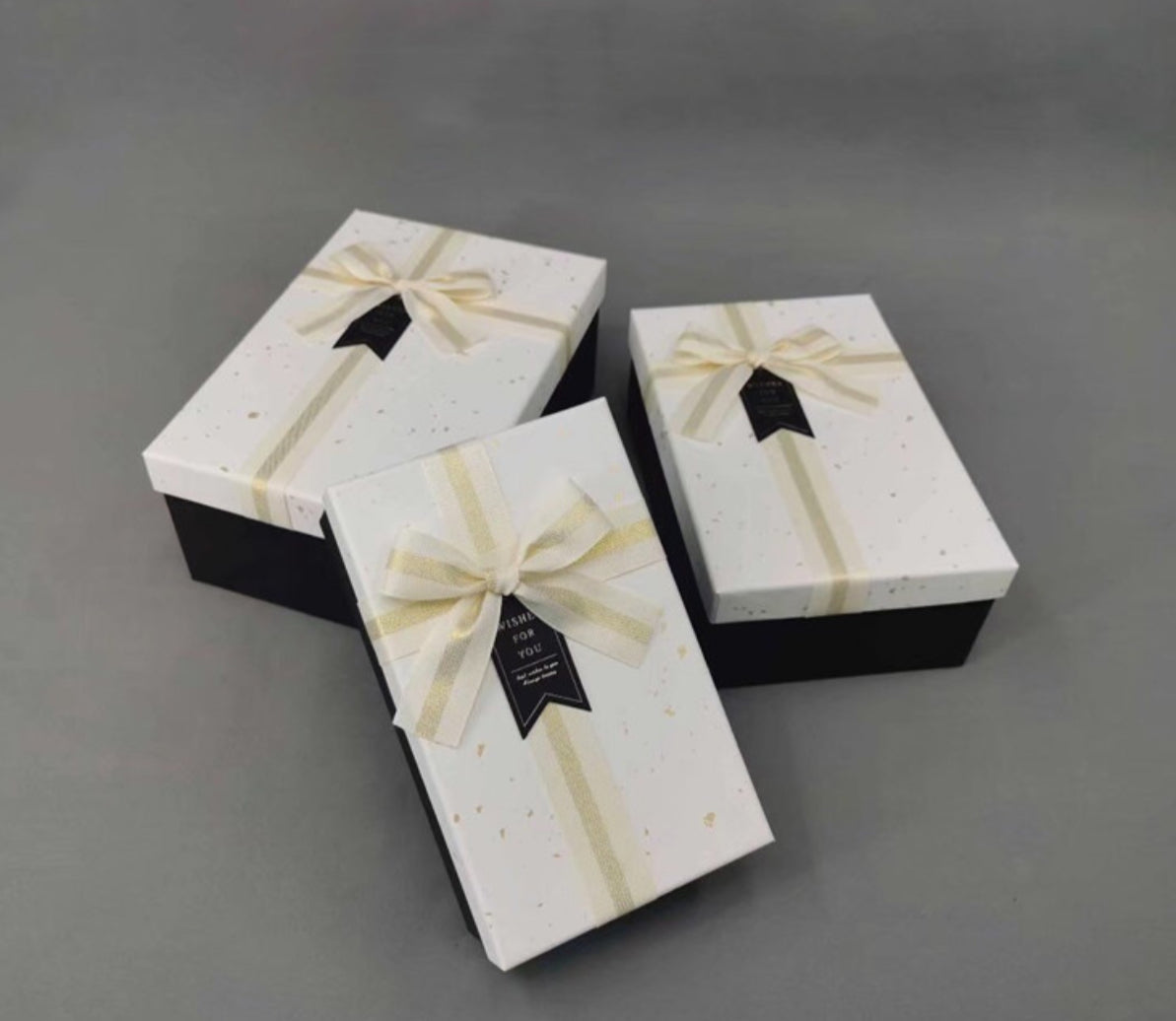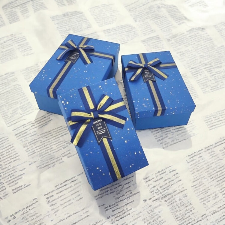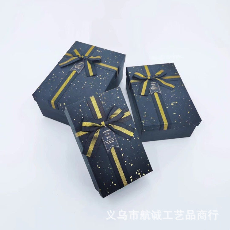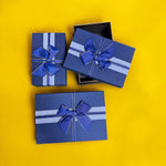 Set me 3 kuti paketimi me fjongo dhe pika gold; Ngjyrat: E bardhë, e zezë, blu; Përmasat: 12 x 22 cm, 14 x 24 cm, 16 x 26 cm