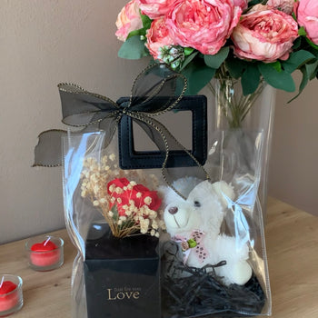 Pako dhurate e gatshme në çantë transparente (trëndafil, arush & kuti kartoni)
