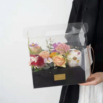 Paketim në formë cante, transparente dhe karton për kompozime si lule, cokollata