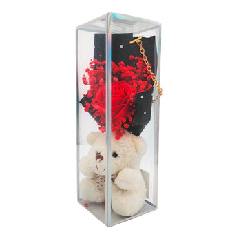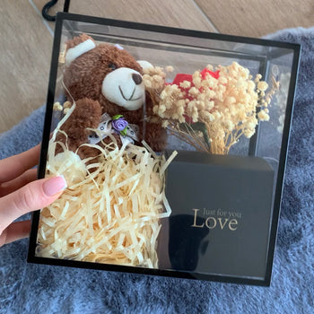 Pako dhurate e gatshme në kuti transparente (trëndafil, arush & kuti kartoni)