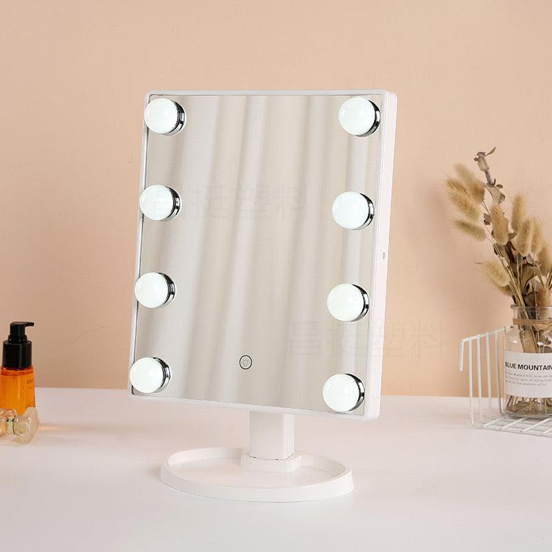 Pasqyrë me drita LED për make up; me mbajtëse për mbështetje dhe për të vendosur make upe-e ; Forma: rrethore me diametër 26 cm dhe gjatësi 28 cm, forma drejtkëndore me përmasa 25 cm x 20 cm; Materiali: Plastik