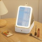 Pasqyrë kozmetike me dritë LED me hapje Që orjentohet sipas dëshirës dhe me hapësirë organizuese për produktet kozmetike