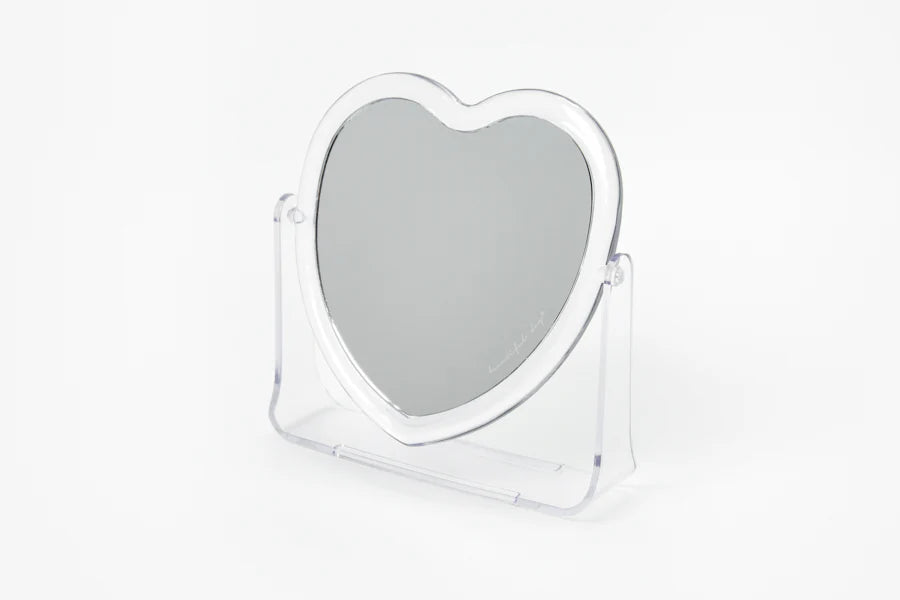 Pasqyrë në formë zemre për make up; me rrotullim; mbajtëse për mbështetje; Përmasa: 25 cm x 20 cm; Materiali: Plastik