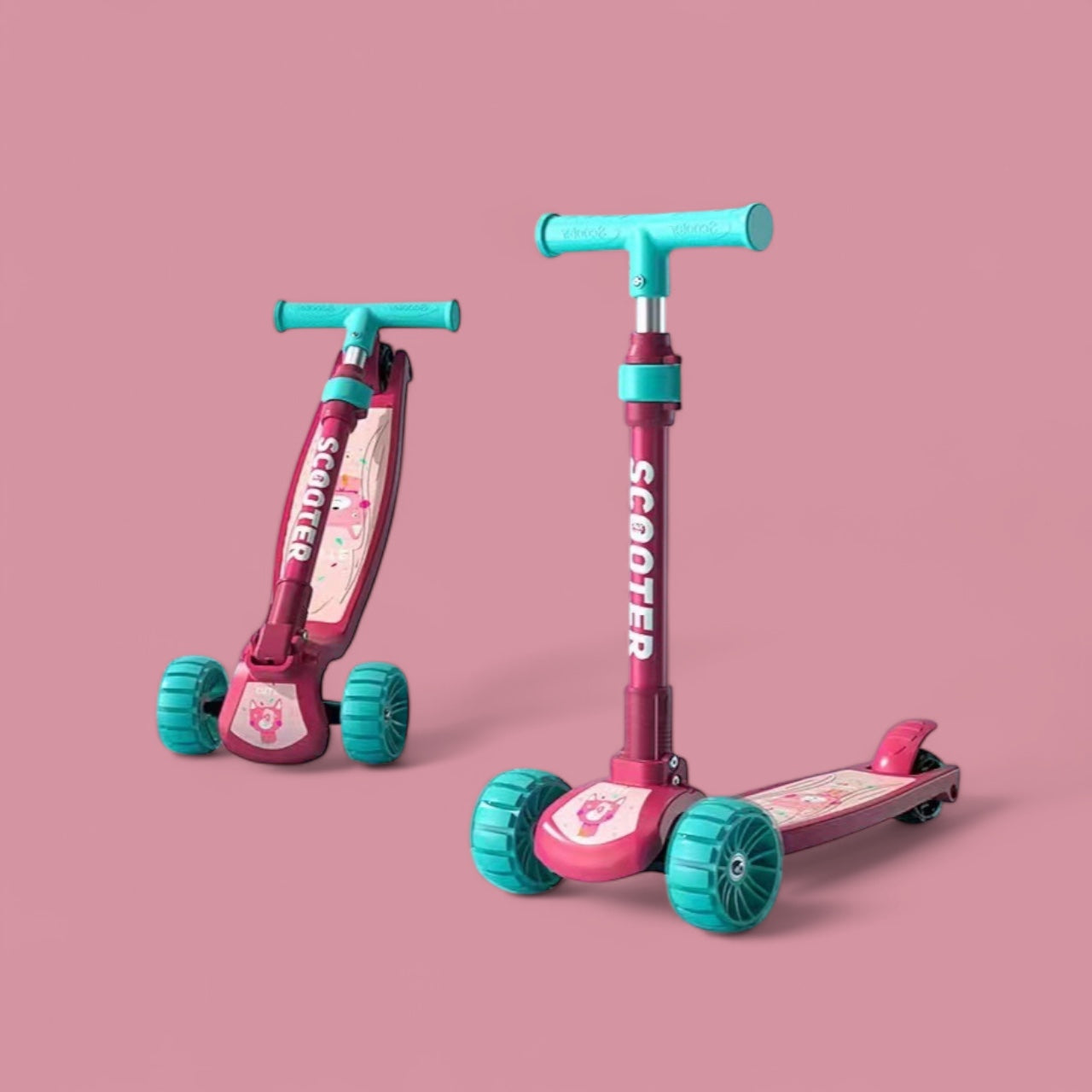 Skuter me figurë macesh ngjyrë rozë; Gjatësi: 63 cm deri në 78 cm; Materiali: Plastik me Metal; Mosha: + 3 vjeç