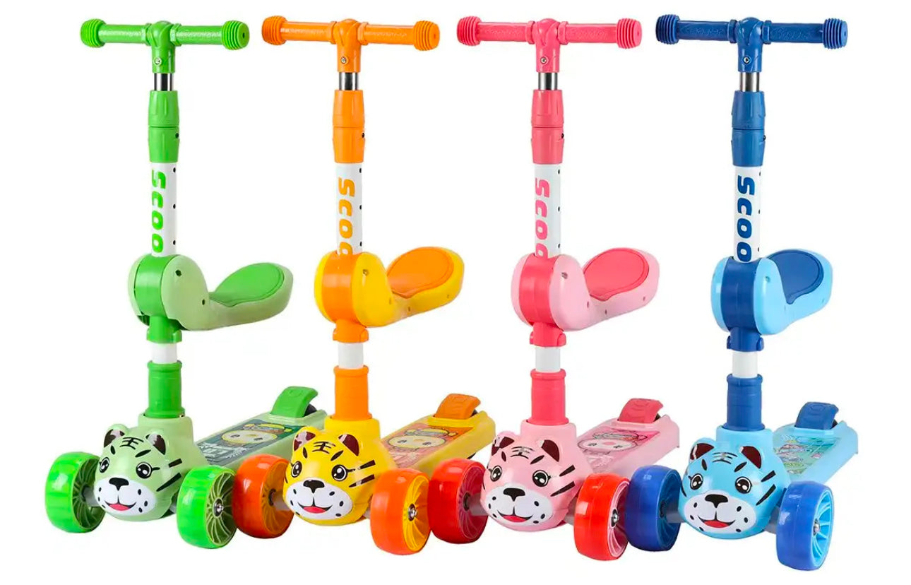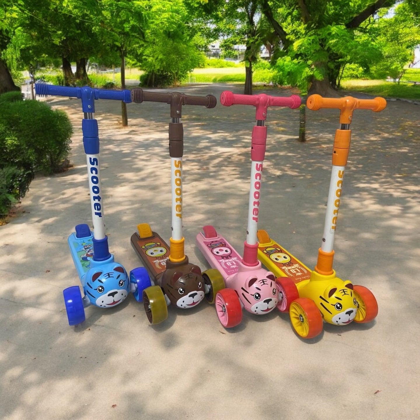 Skuter me figurë tigri për fëmijë; Ngjyra: Rozë, blu; Përnasa: 60 x 41 cm; Shkon deri në 78 cm gjatësi; Mosha: 3-12 vjeç