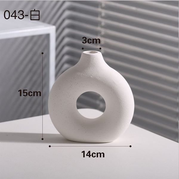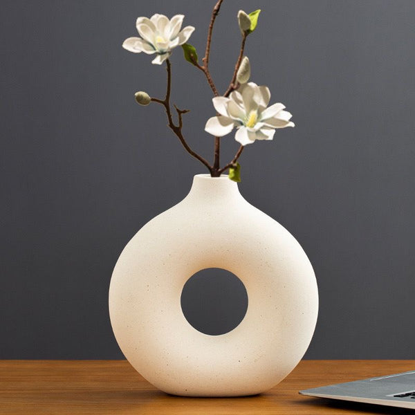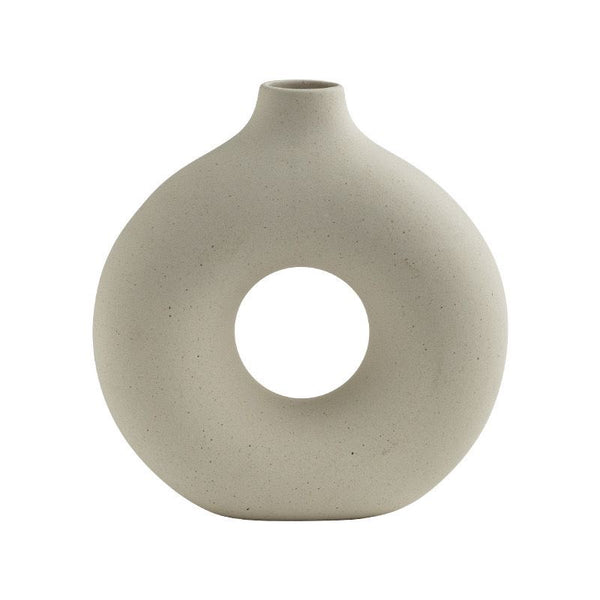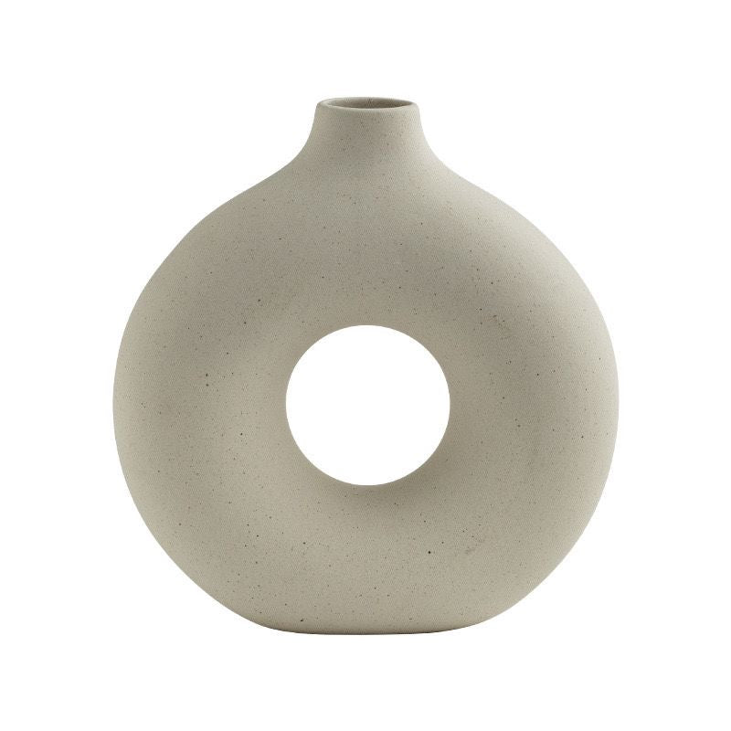 Vazo qeramike dekorative me formë moderne dhe dizajn gjysmëhëne. E punuar me teksturë mat dhe ngjyrë neutrale, përshtatet në mënyrë perfekte me çdo stil arredimi. Ideale për lule artificiale ose...