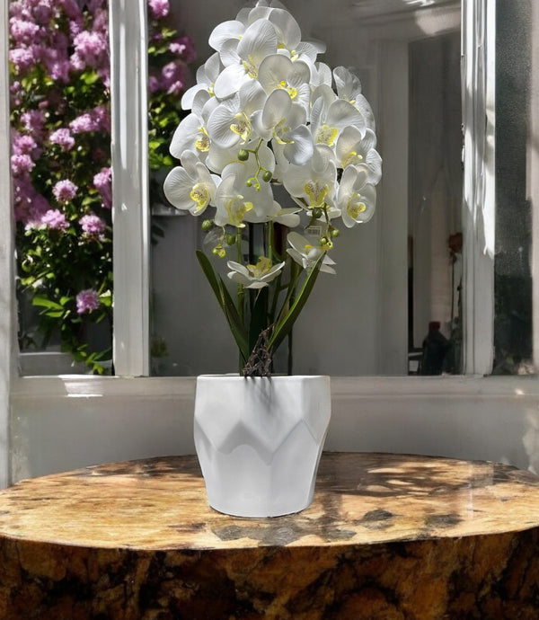 Vazo dekorative me Orkide; Materiali: Qeramike; Forma gjeometrike; Përmasa: 60 cm x 16 cm