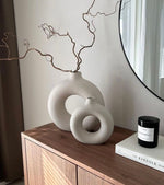 Vazo qeramike dekorative me formë moderne dhe dizajn abstrakt. E punuar me teksturë mat dhe ngjyrë neutrale, përshtatet në mënyrë perfekte me çdo stil arredimi. Ideale për lule artificiale ose...