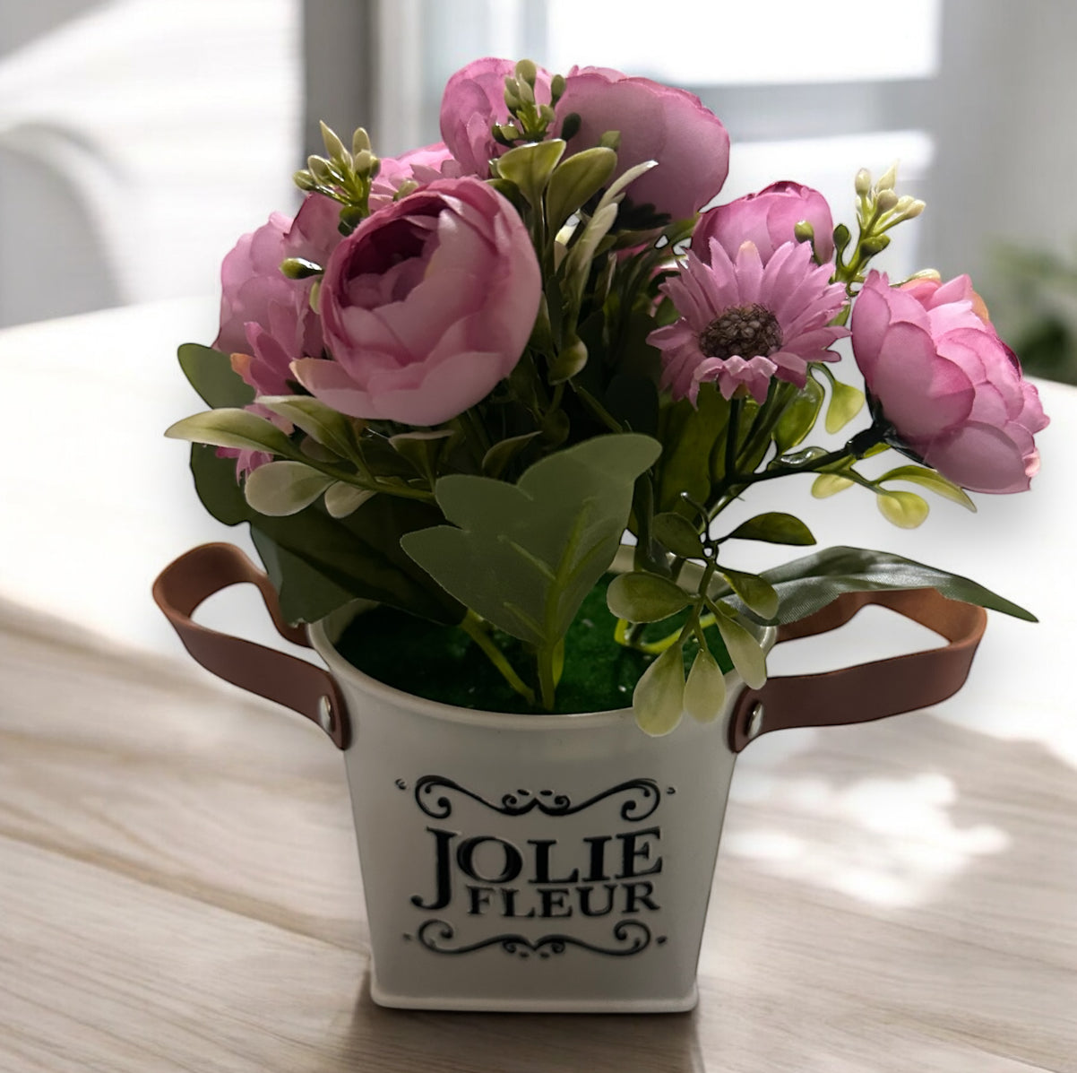 Vazo e vogël me Peony; Vazo e bardhë me detaje lëkure ; Gjatësi: 20 cm