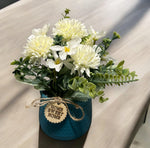 Vazo e vogël me miks lulesh; Ngjyra: Vazo kafe me lule portokalli, vazo blu me lule të bardha; Gjatësi: 20 cm