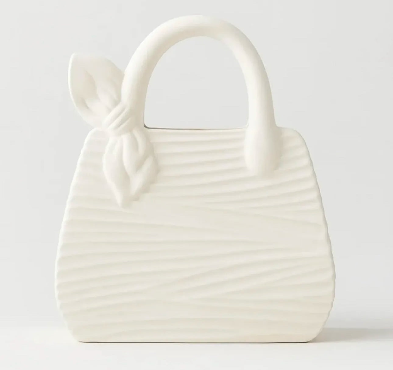 Vazo e vogël qeramike në formë çante me fjongo, ngjyrë e bardhë