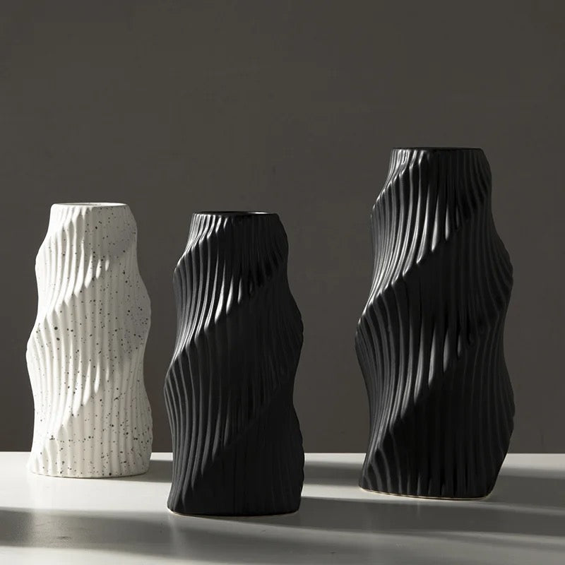 Vazo qeramike stil modern; Me valëzime; Ngjyra: e zezë, e bardhë; Gjatësia: 20 cm