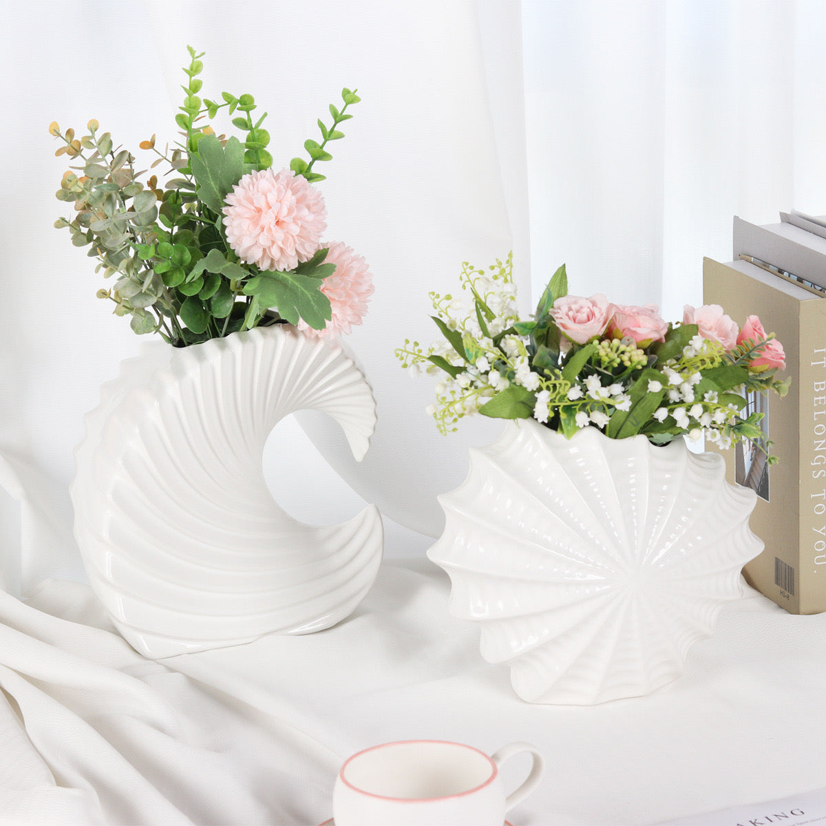 Vazo qeramike dekorative me formë moderne dhe dizajn gjysmëhëne. E punuar me teksturë mat dhe ngjyrë neutrale, përshtatet në mënyrë perfekte me çdo stil arredimi. Ideale për lule artificiale ose...