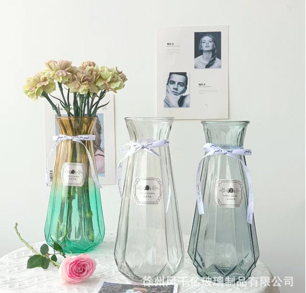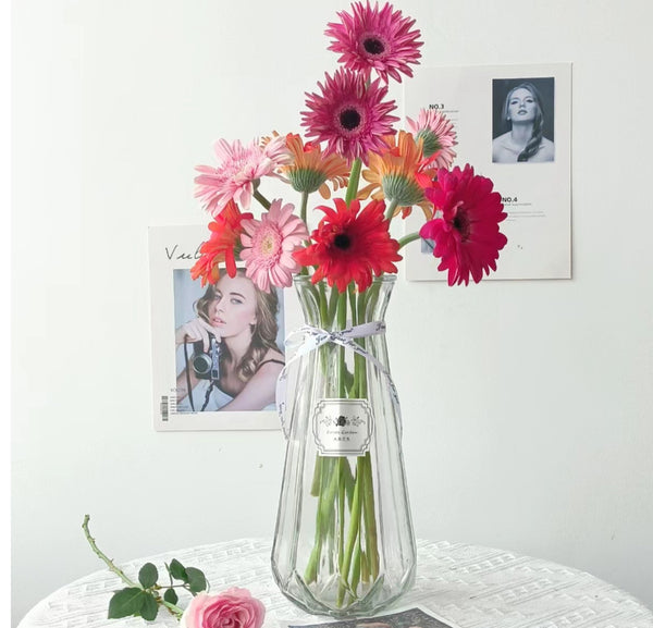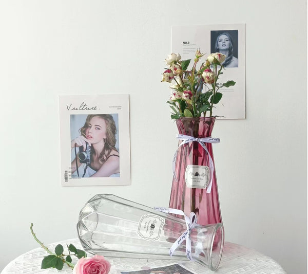 Vazo qelqi me fjongo dhe etiketë; Qelq i punuar deri në detaje; Ngjyra transparente; Gjatësi: 30 cm