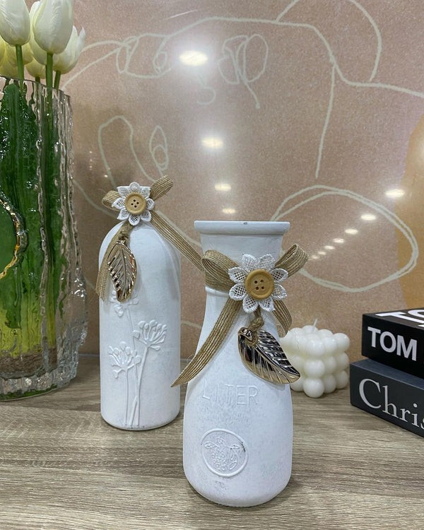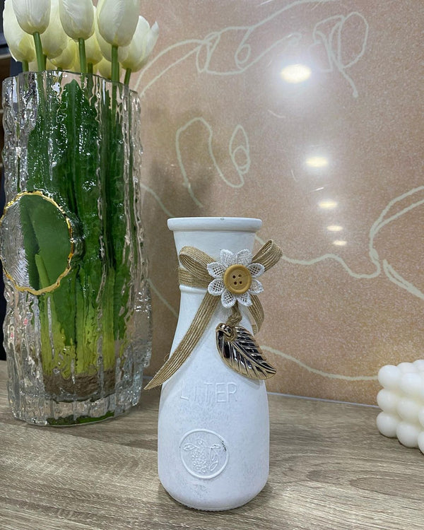 Vazo qeramike e bardhë në formë shtambe me grykë të ngushtë me përmasa baza 10 cm x H23 cm