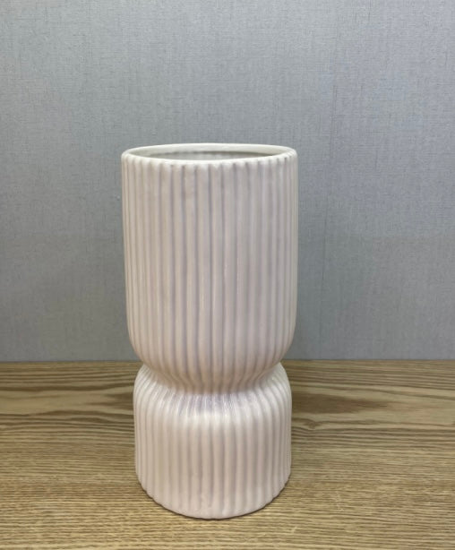 Vazo qeramike me damarë vertikalë dhe horizontalë, me dizajn modern dhe elegant që përshtatet në çdo ambient. Ideale për lule ose si dekor më vete, duke shtuar stil dhe finesë...