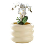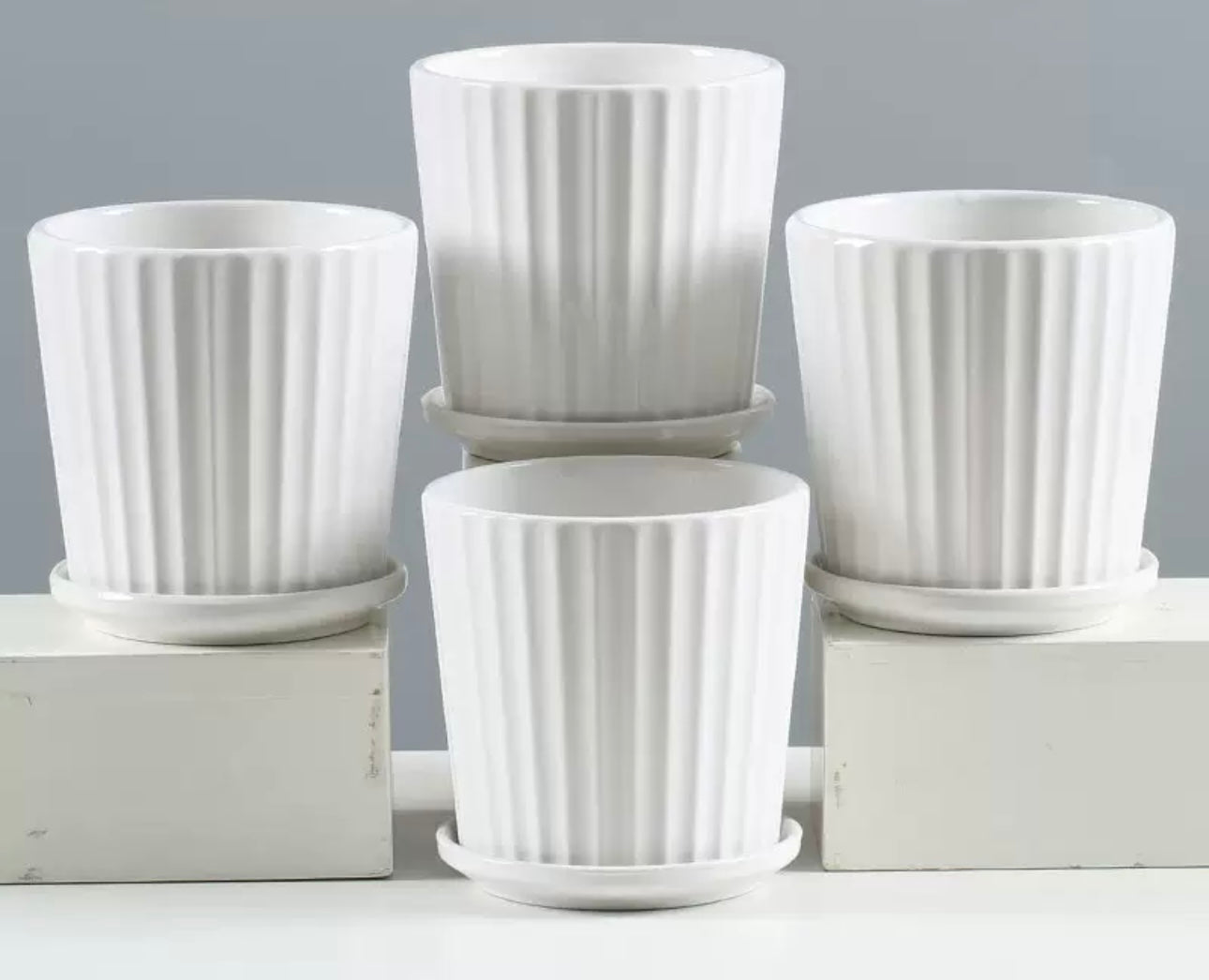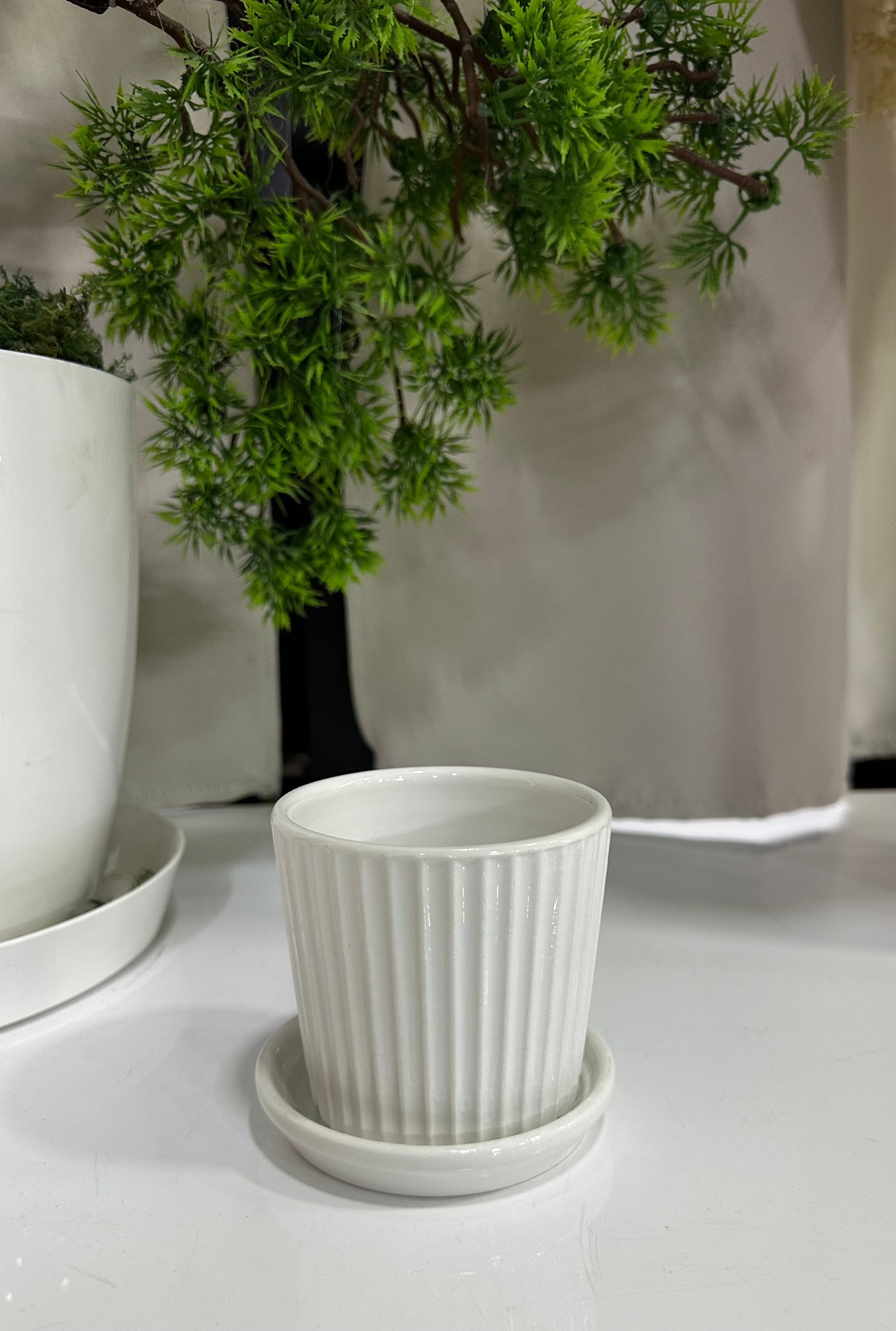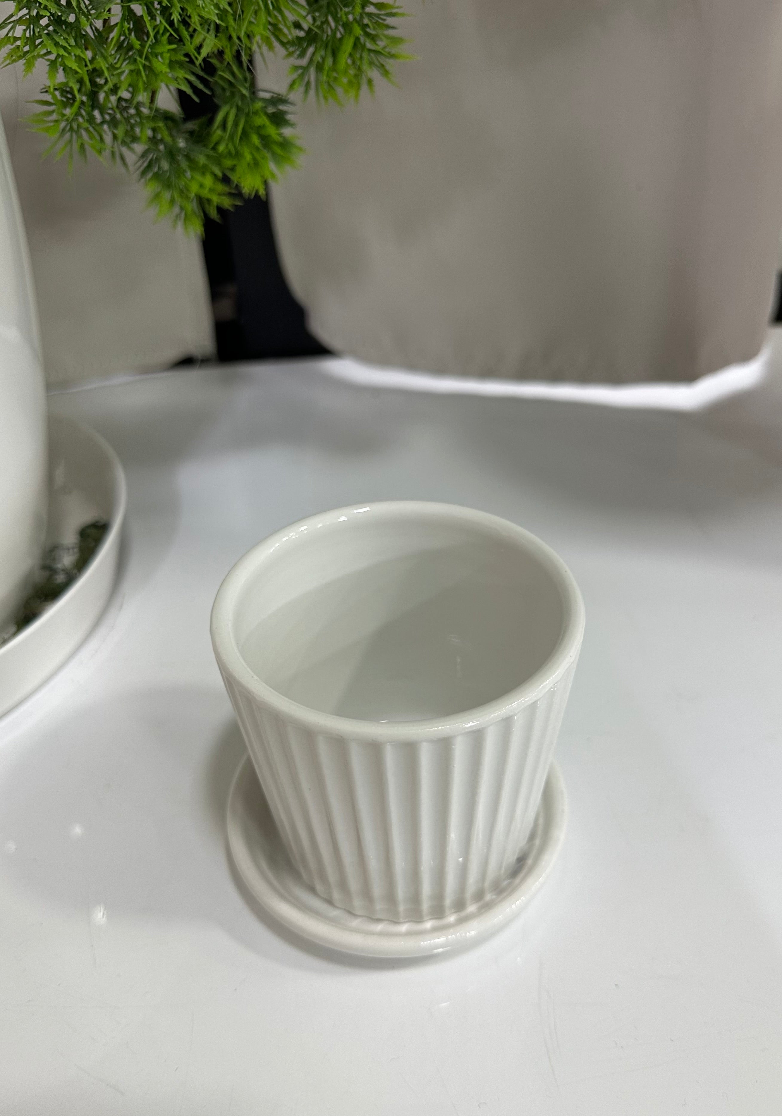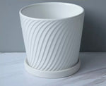 Vazo qeramike e bardhë me reliev linear. Ideale për lule apo bimë dekorative, e qëndrueshme dhe e përshtatshme.