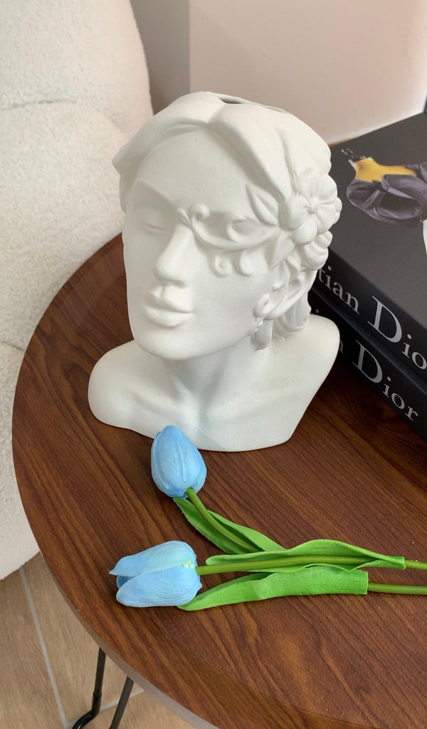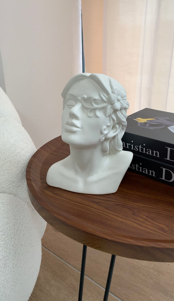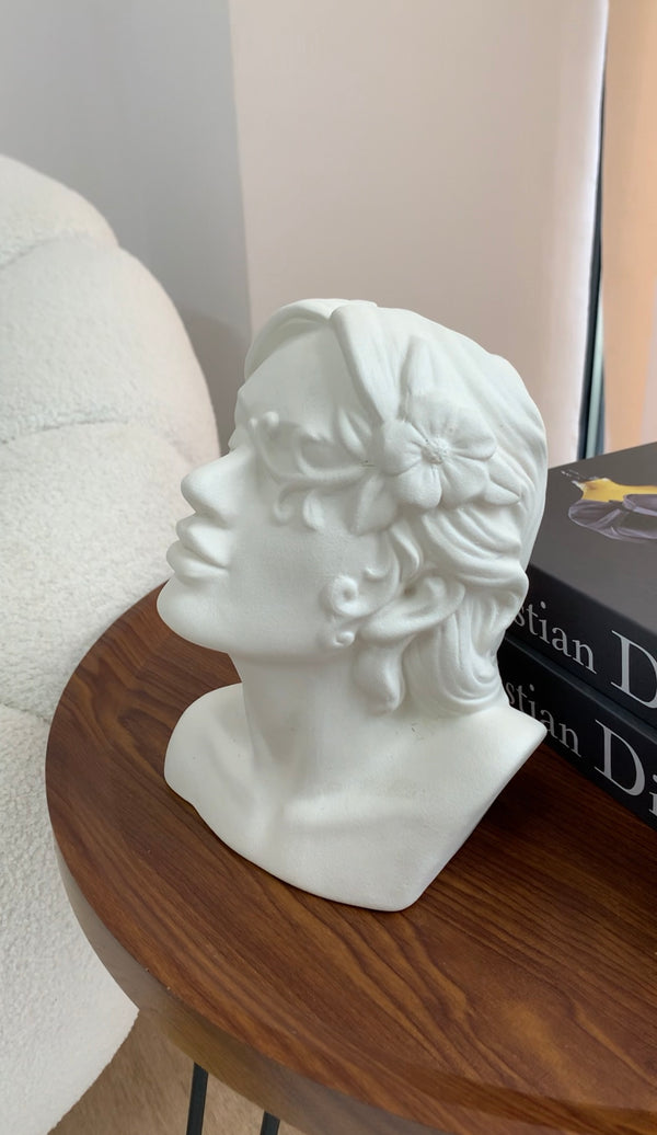 Vazo qeramike me bust të një gruaje ku gjysma e portretit është me lule