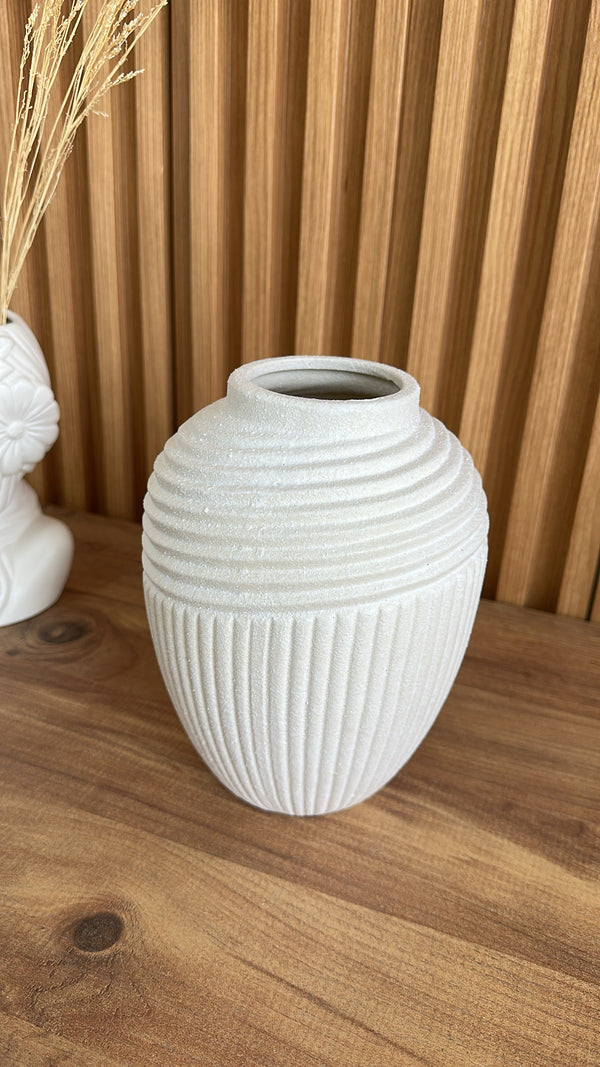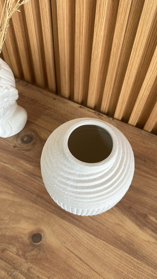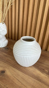 Vazo qeramike me damarë vertikalë dhe horizontalë, me dizajn modern dhe elegant që përshtatet në çdo ambient. Ideale për lule ose si dekor më vete, duke shtuar stil dhe finesë në hapësirën tuaj.