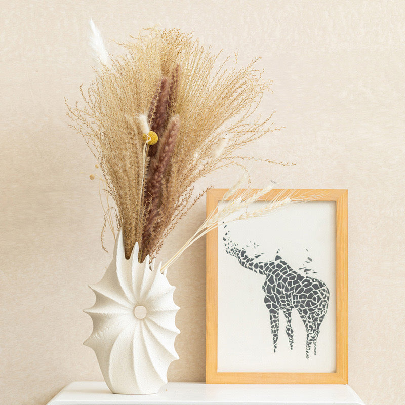 Vazo qeramike dekorative me formë moderne dhe dizajn gjysmëhëne. E punuar me teksturë mat dhe ngjyrë neutrale, përshtatet në mënyrë perfekte me çdo stil arredimi. Ideale për lule artificiale ose...
