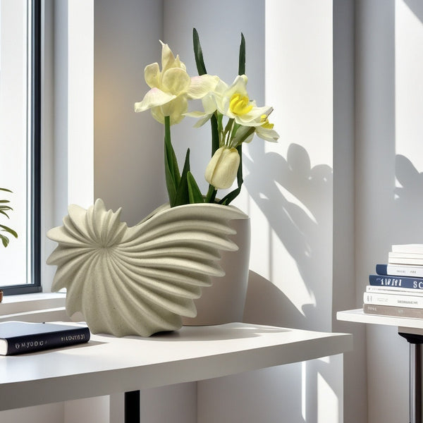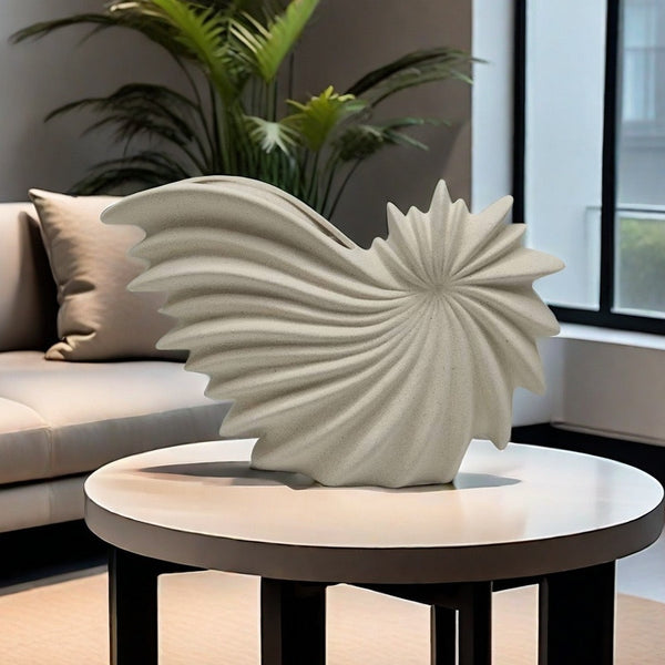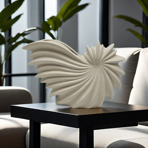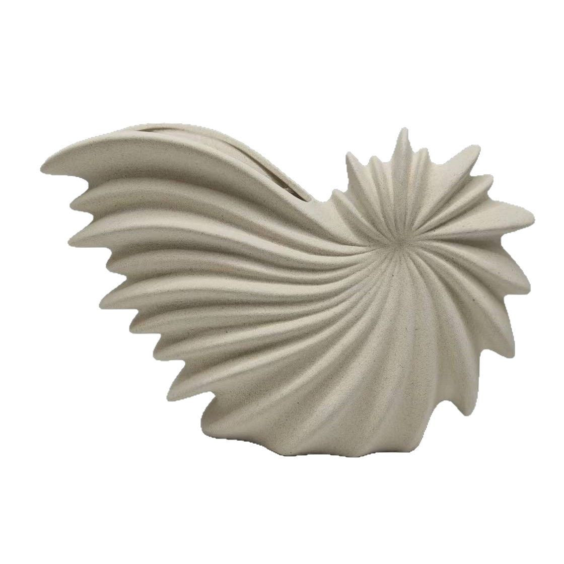 Vazo qeramike dekorative me formë moderne dhe dizajn abstrakt. E punuar me teksturë mat dhe ngjyrë neutrale, përshtatet në mënyrë perfekte me çdo stil arredimi. Ideale për lule artificiale ose...