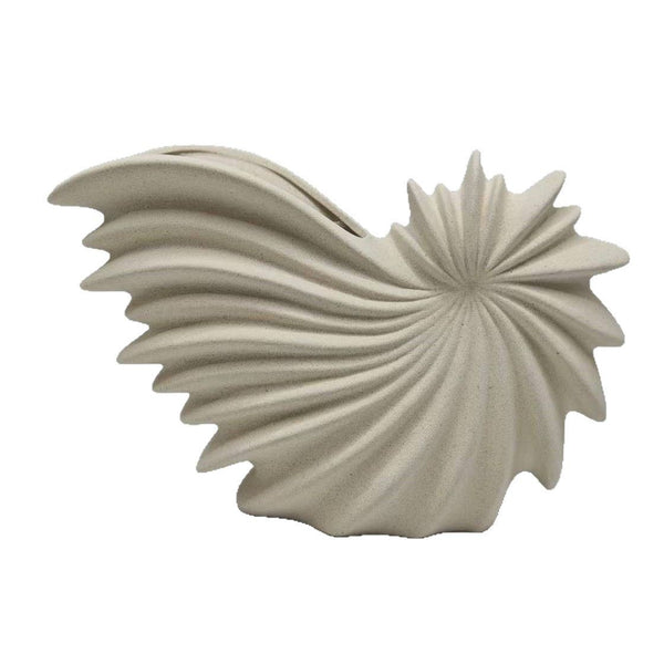 Vazo qeramike dekorative me formë moderne dhe dizajn gjysmëhëne. E punuar me teksturë mat dhe ngjyrë neutrale, përshtatet në mënyrë perfekte me çdo stil arredimi. Ideale për lule artificiale ose...
