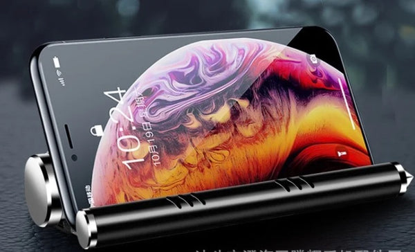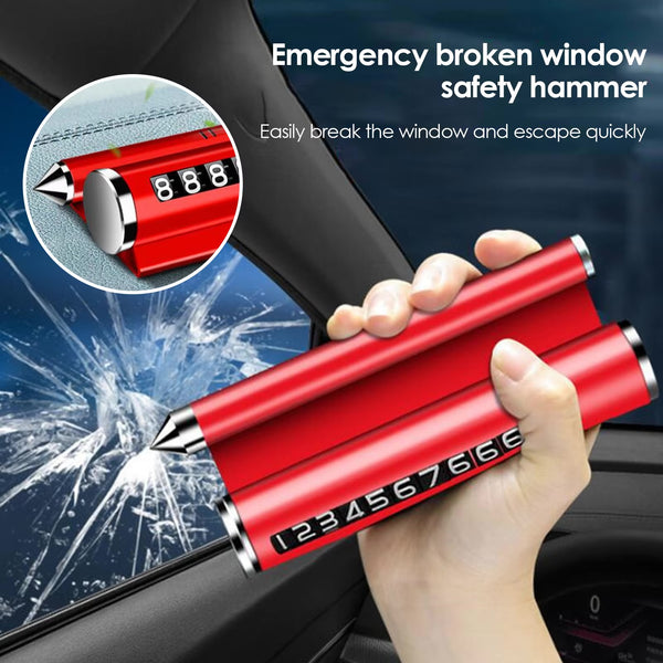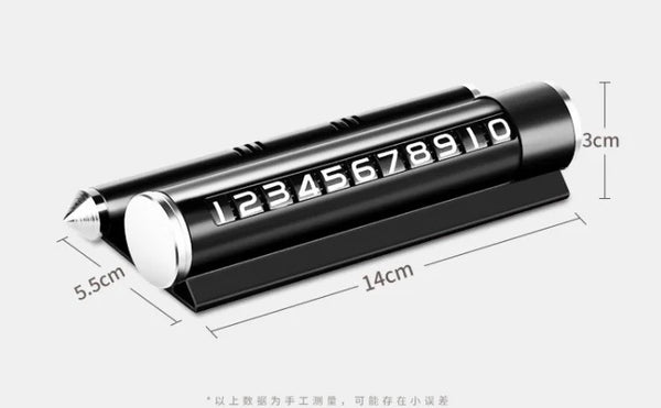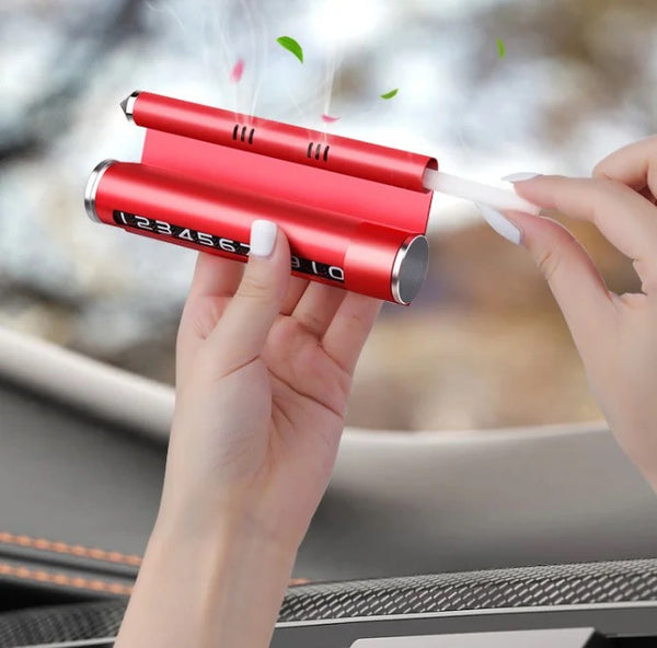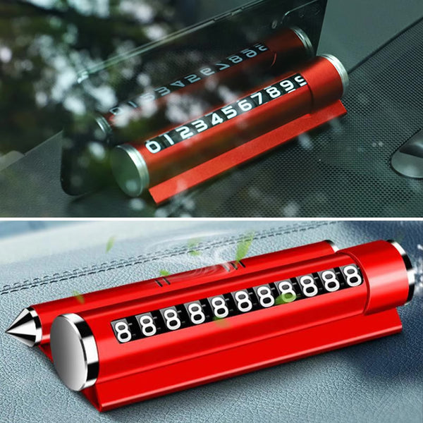 Aksesor për makinën me 4 funksione: shërben si tabelë me numra për parkim; thyen xhamin në rast bllokimi nga aksidenti; mban telefonin dhe shërben si aromatizues; Përmasa: 15.5*16.5*3.5cm