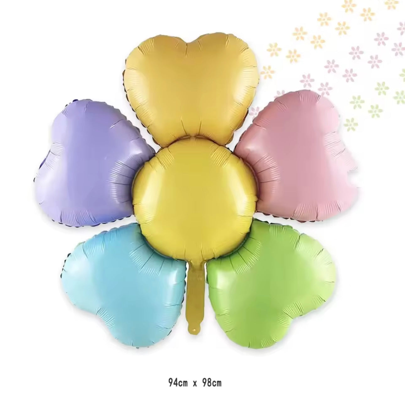 Balonë folie në formë luleje me zemra shumëngjyrëshe, ideale për festa dhe evente për fëmijë.