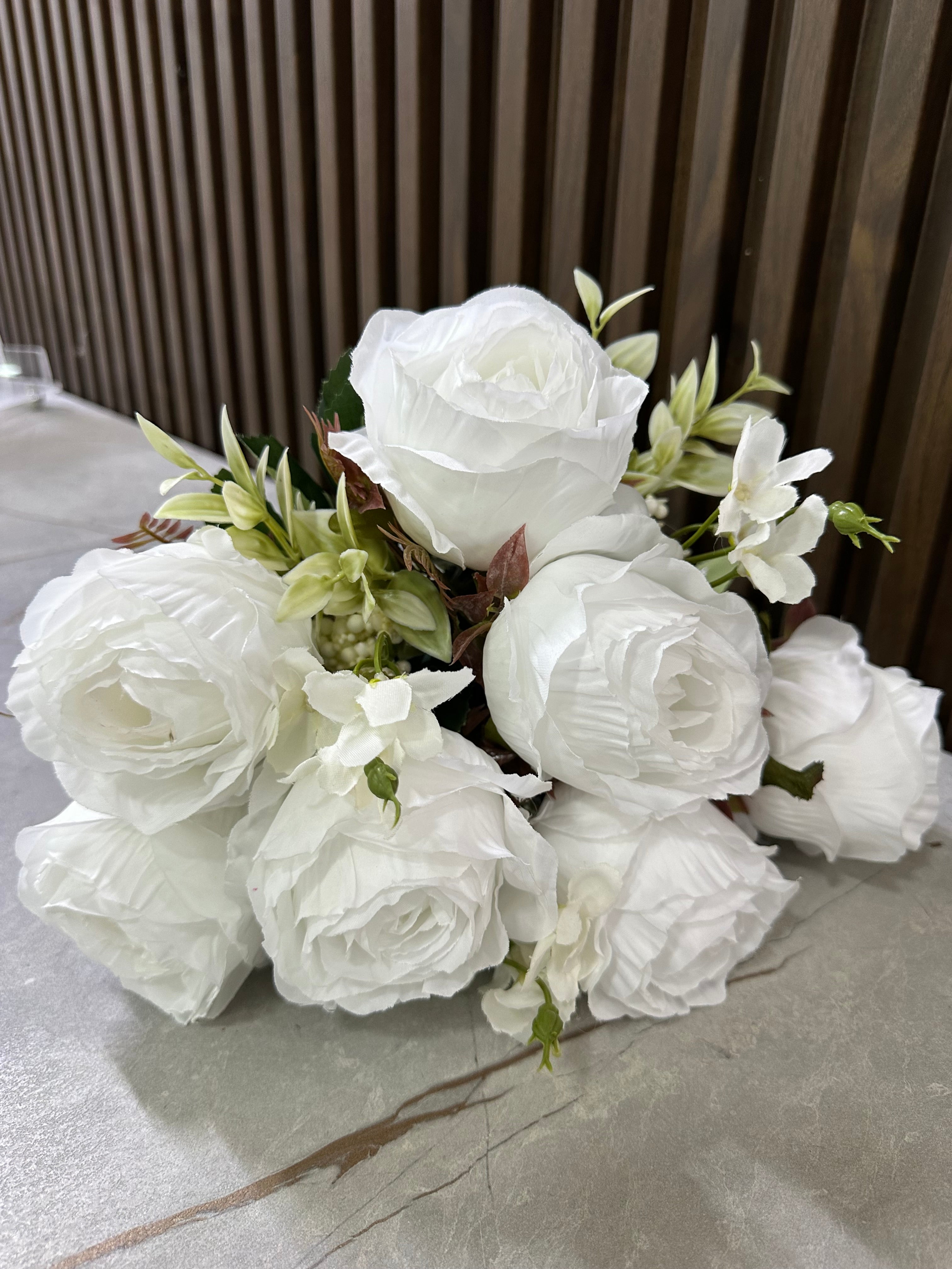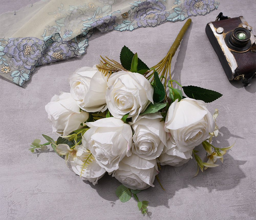 Buqetë artificiale me trëndafila të bardhë, dekor dhe i përjetshëm