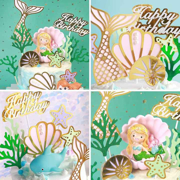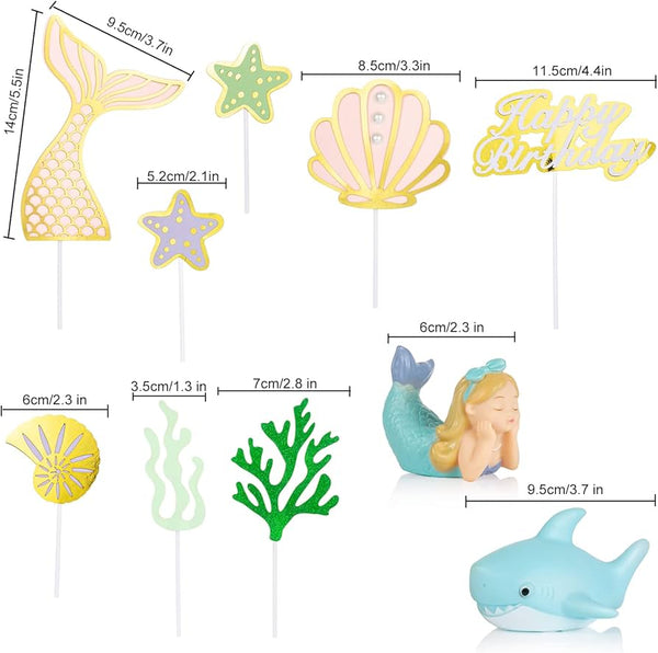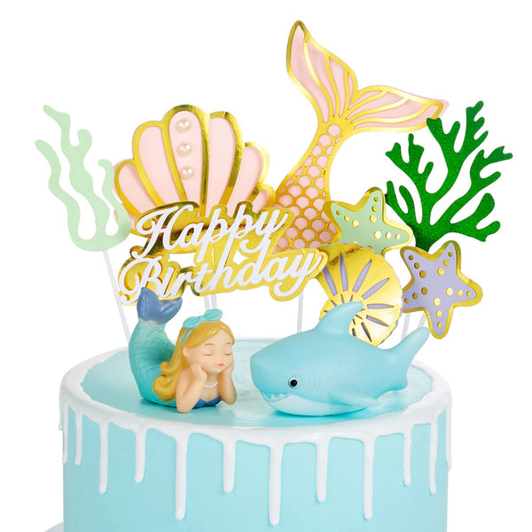 Cake topper me sirenë dhe figura detare, set me 7 copë; Përmasa nga 14 cm më e madhja deri në 3.5 cm më e vogla