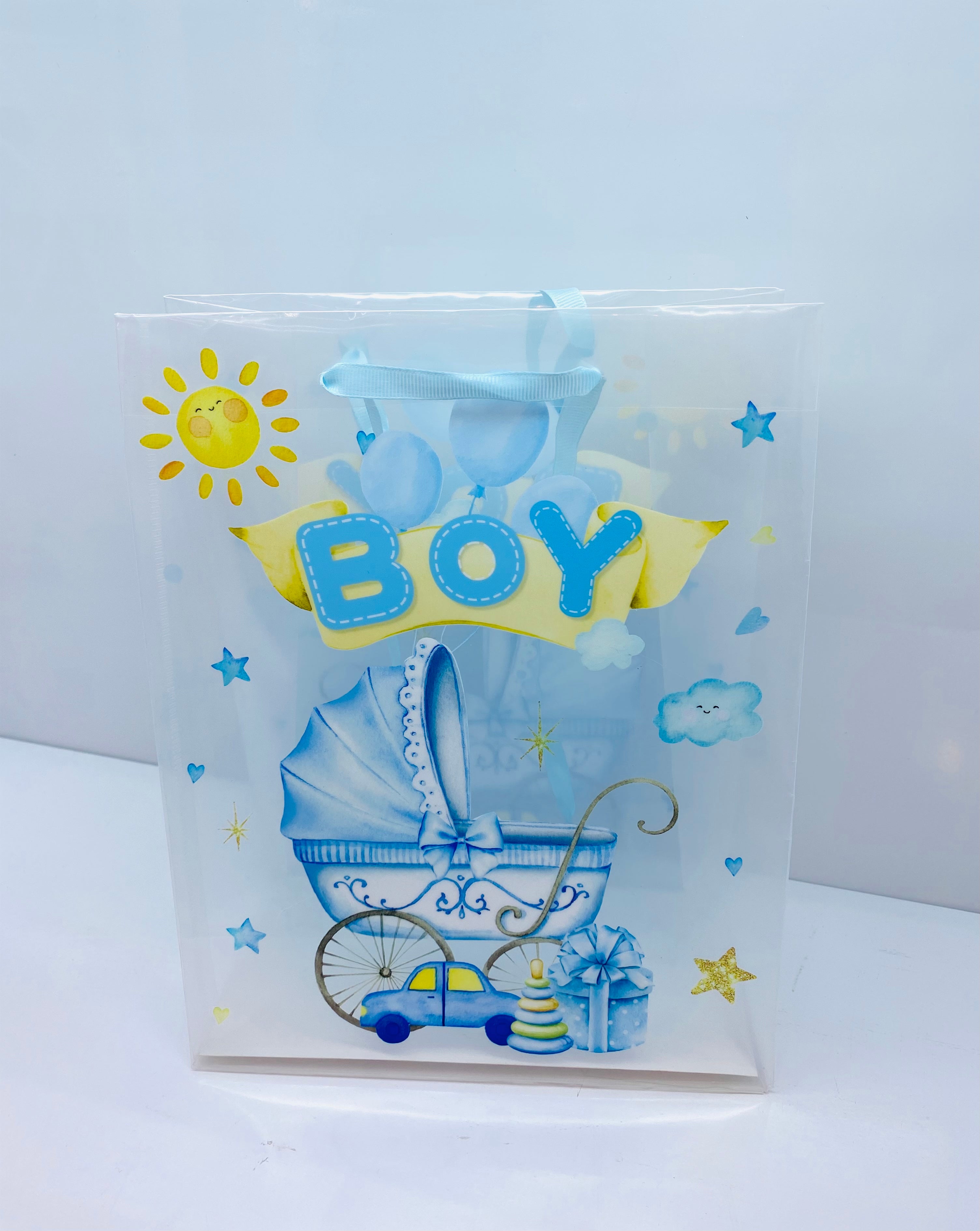 Çantë paketimi transparente "Boy" me karrocë bebesh, dhurata dhe tullumbace