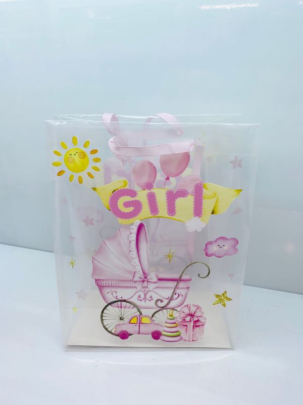 Çantë paketimi transparente "Girl" me karrocë bebesh, dhurata dhe tullumbace