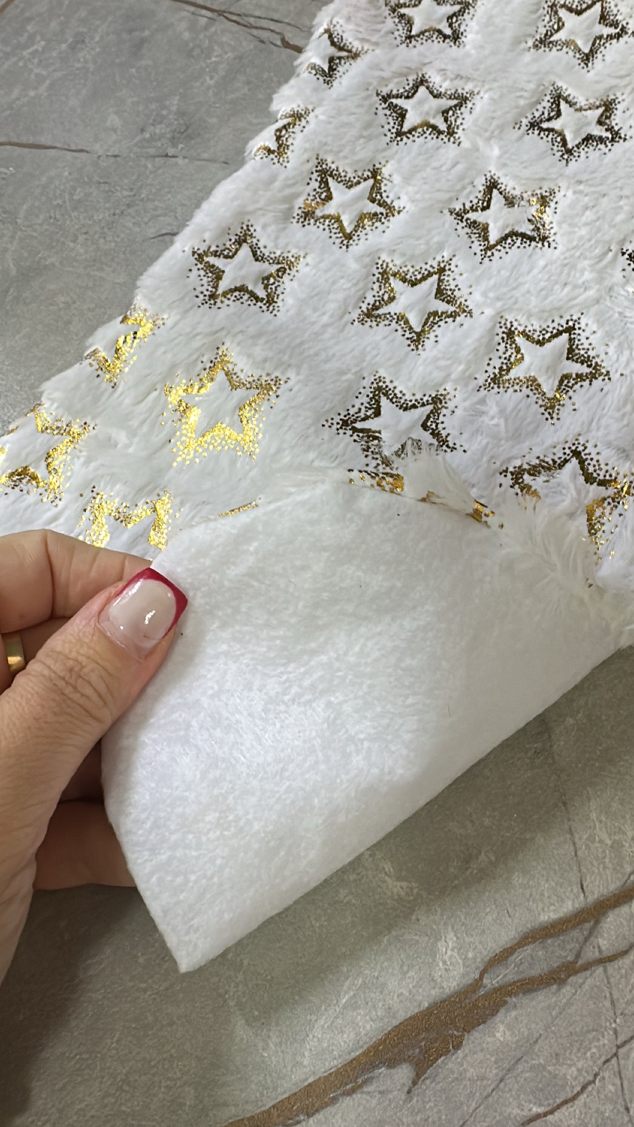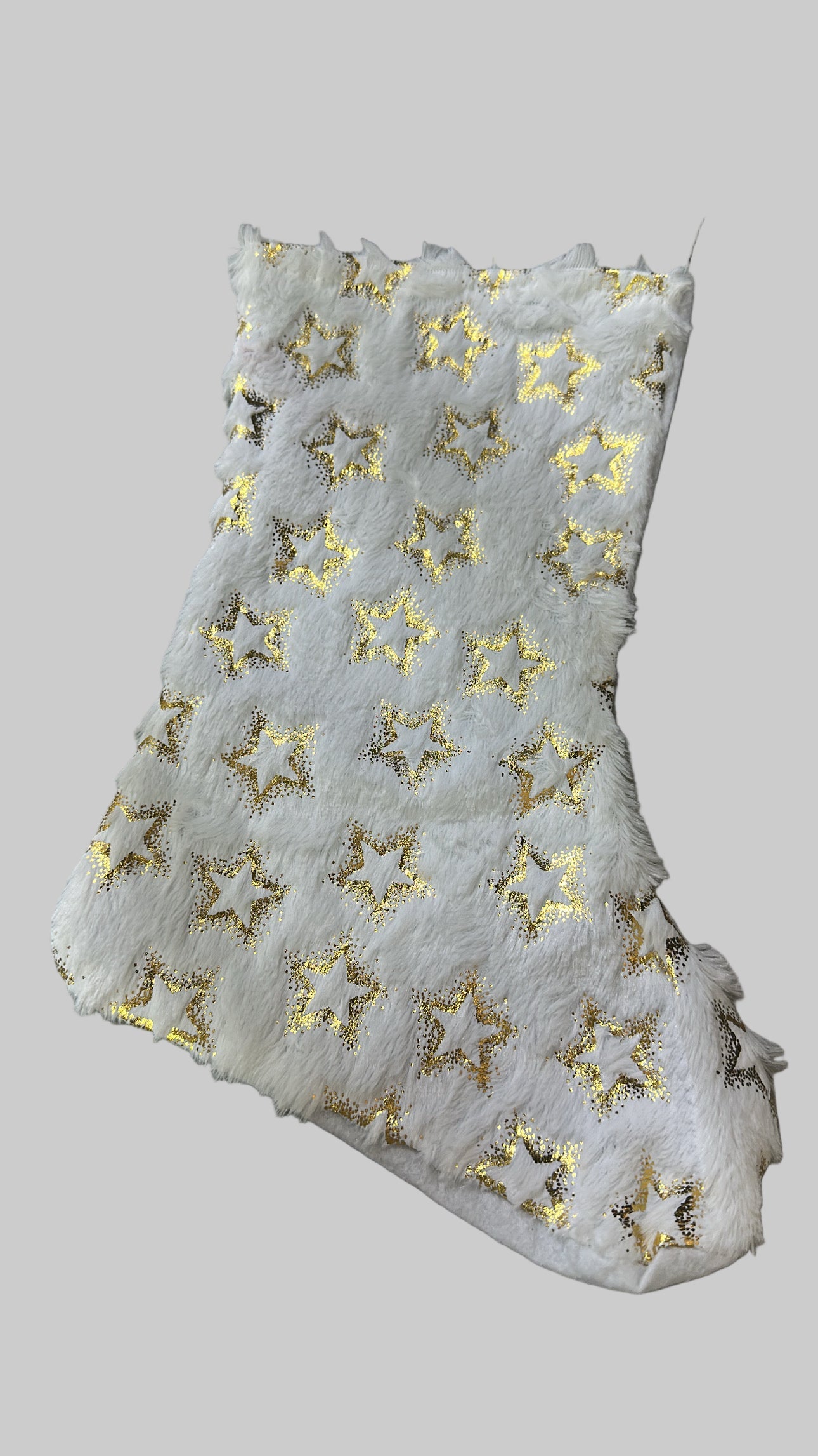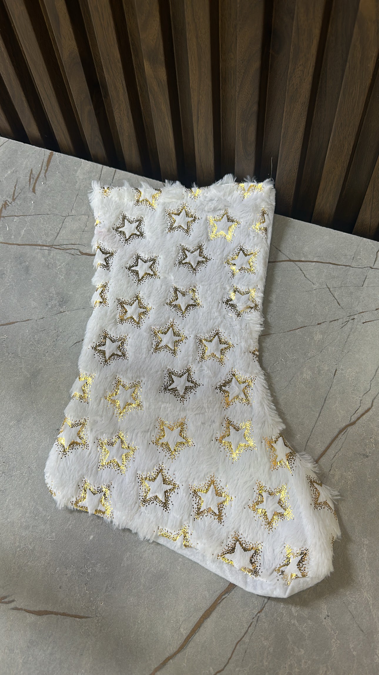 Çorape të bardha prej pellushi me yje të artë, të buta dhe festive, perfekte për dekorim ose dhuratë Krishtlindjesh.