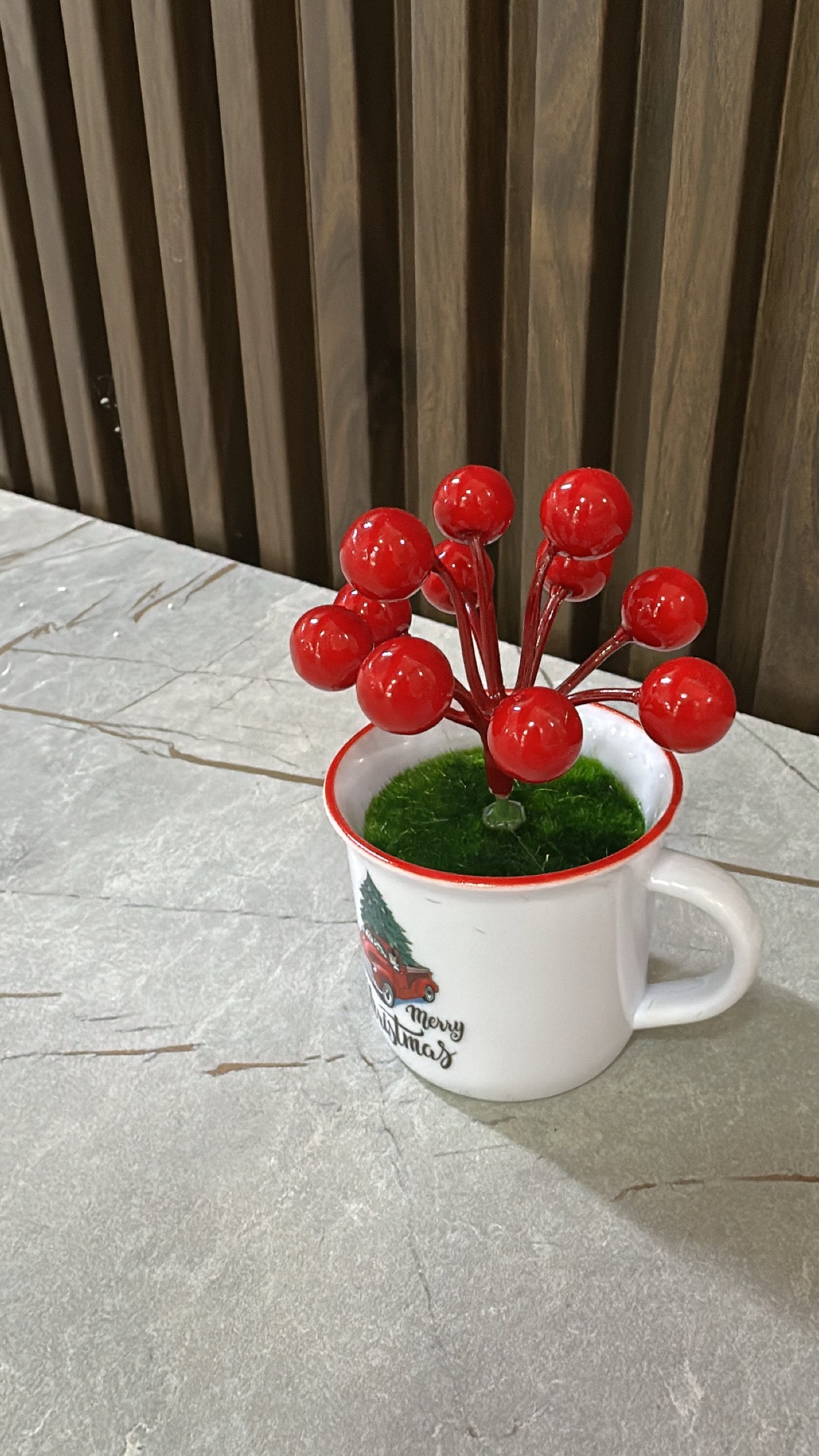 Dekori i Krishtlindjes ka degë artificiale cherry të kuqe dhe një filxhan të vogël xingato, ideal për tavolina festive ose kompozime dekorative.