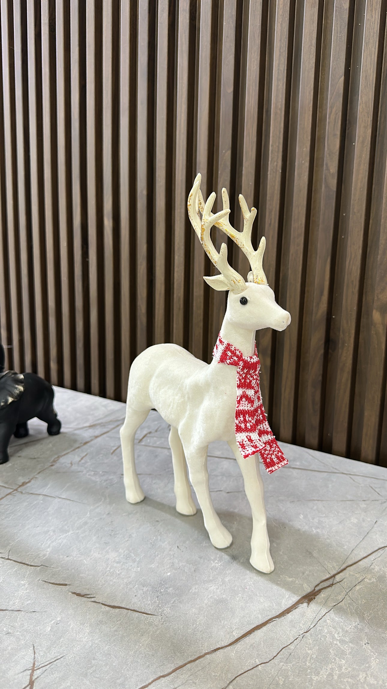 Dekor dreri elegant në ngjyrë të bardhë. me brirë të artë dhe shall të kuq. Përshtatet për dekor shtëpie gjatë festave. Jep atmosferë të ngrohtë dhe festive.