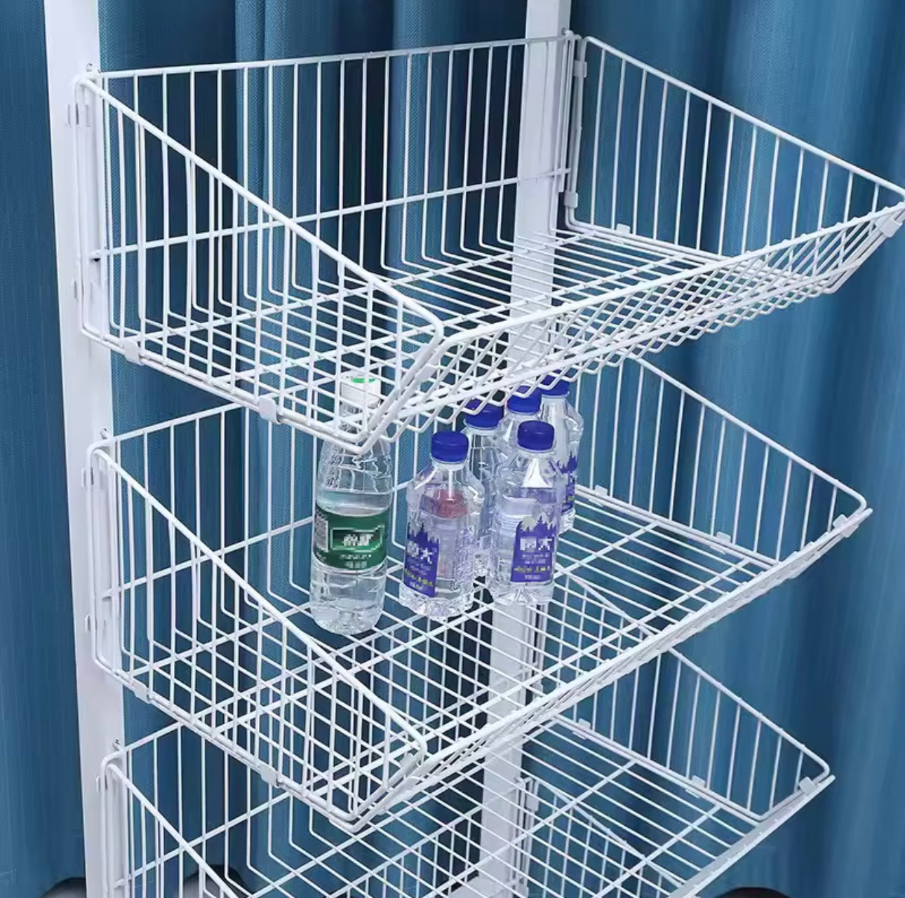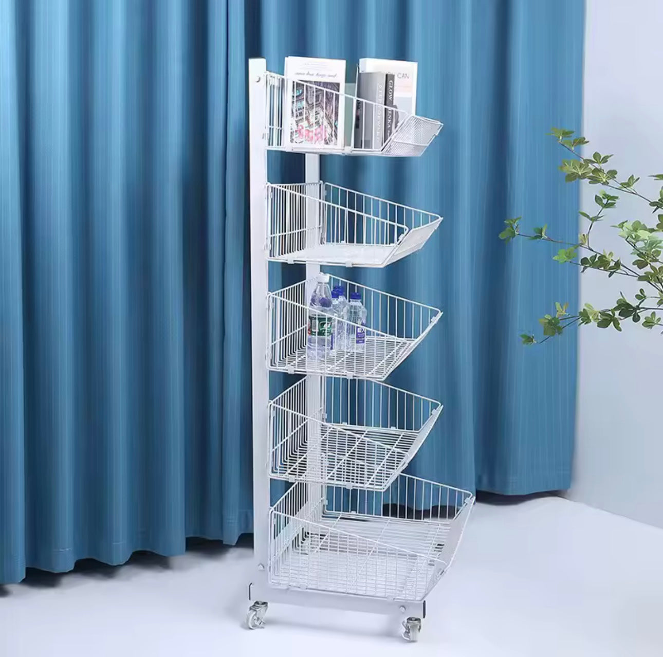 Ekspozitor metalik me shporta të pjerrëta dhe rrota