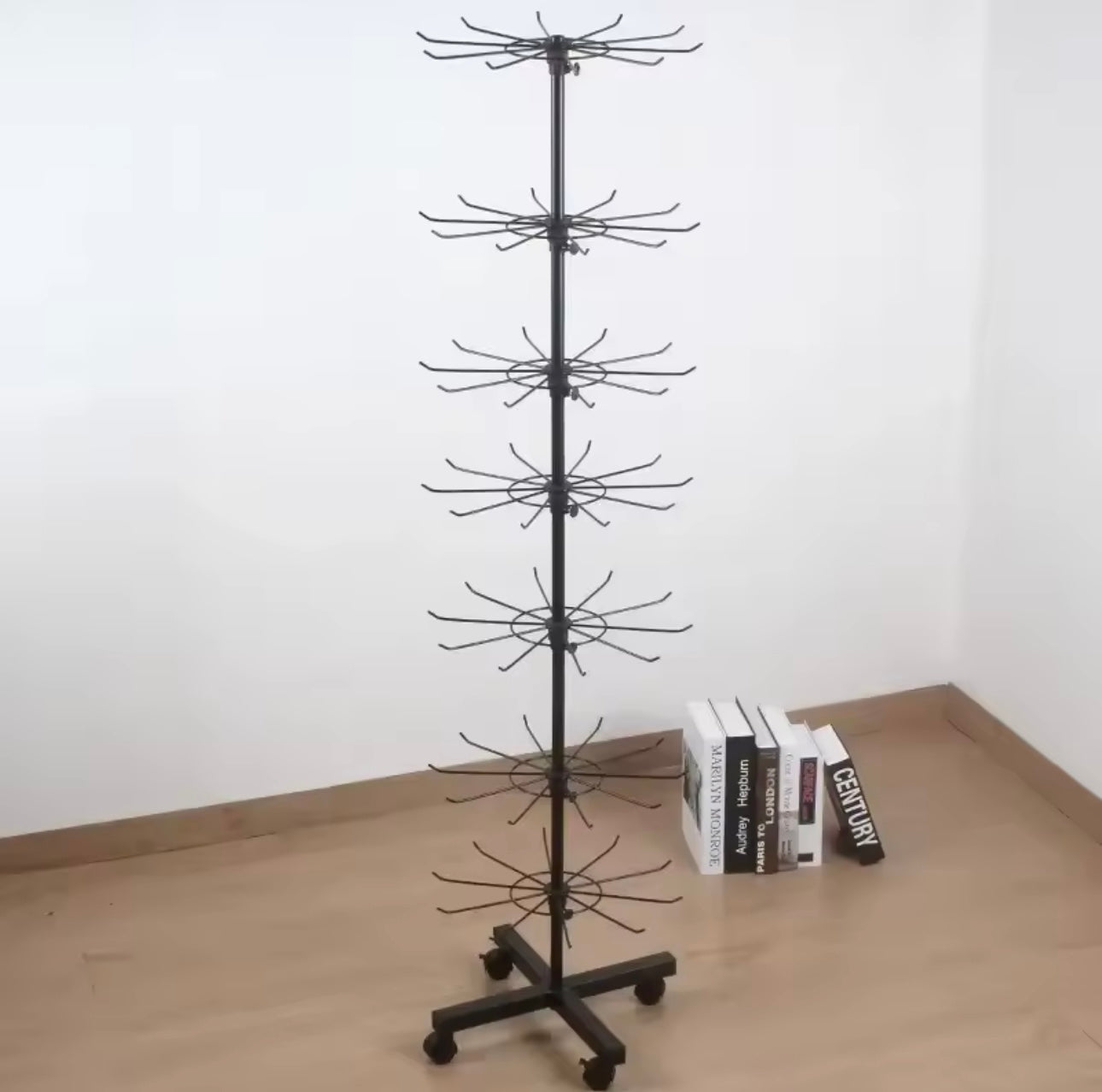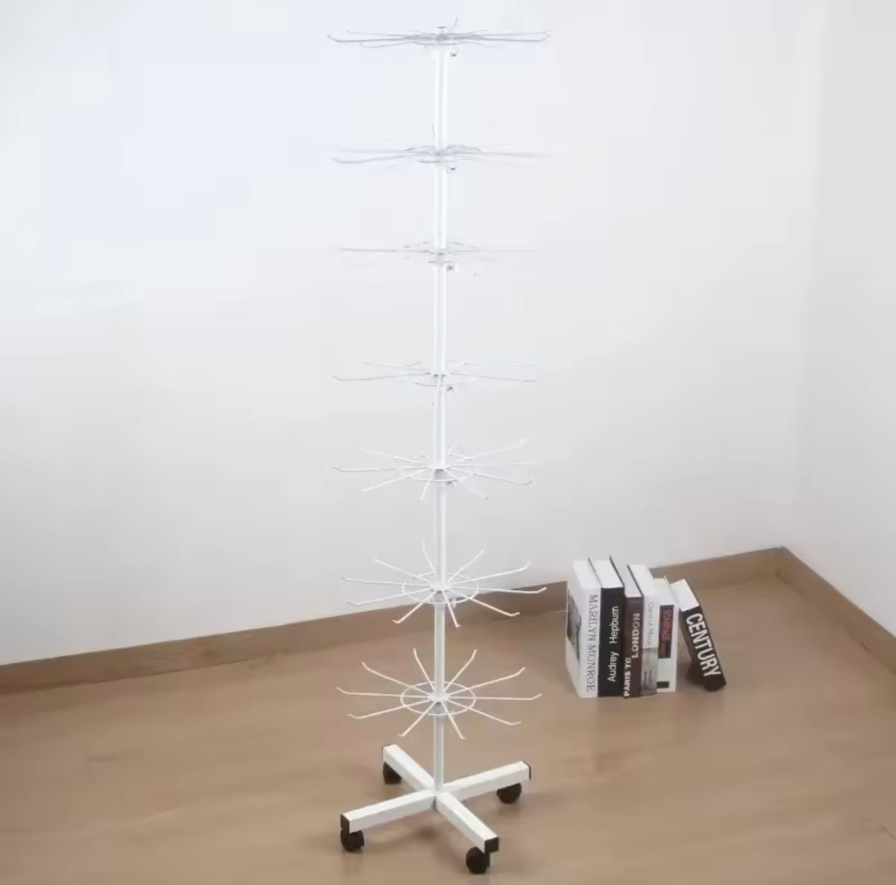 Ekspozitor rrotullues metalik me 7 kate, praktik dhe i lëvizshëm, ideal për organizimin dhe ekspozimin e aksesorëve në dyqan ose showroom. Materiali: Metalike. Ngjyra: E bardhë. Përmasat: H163 cm.